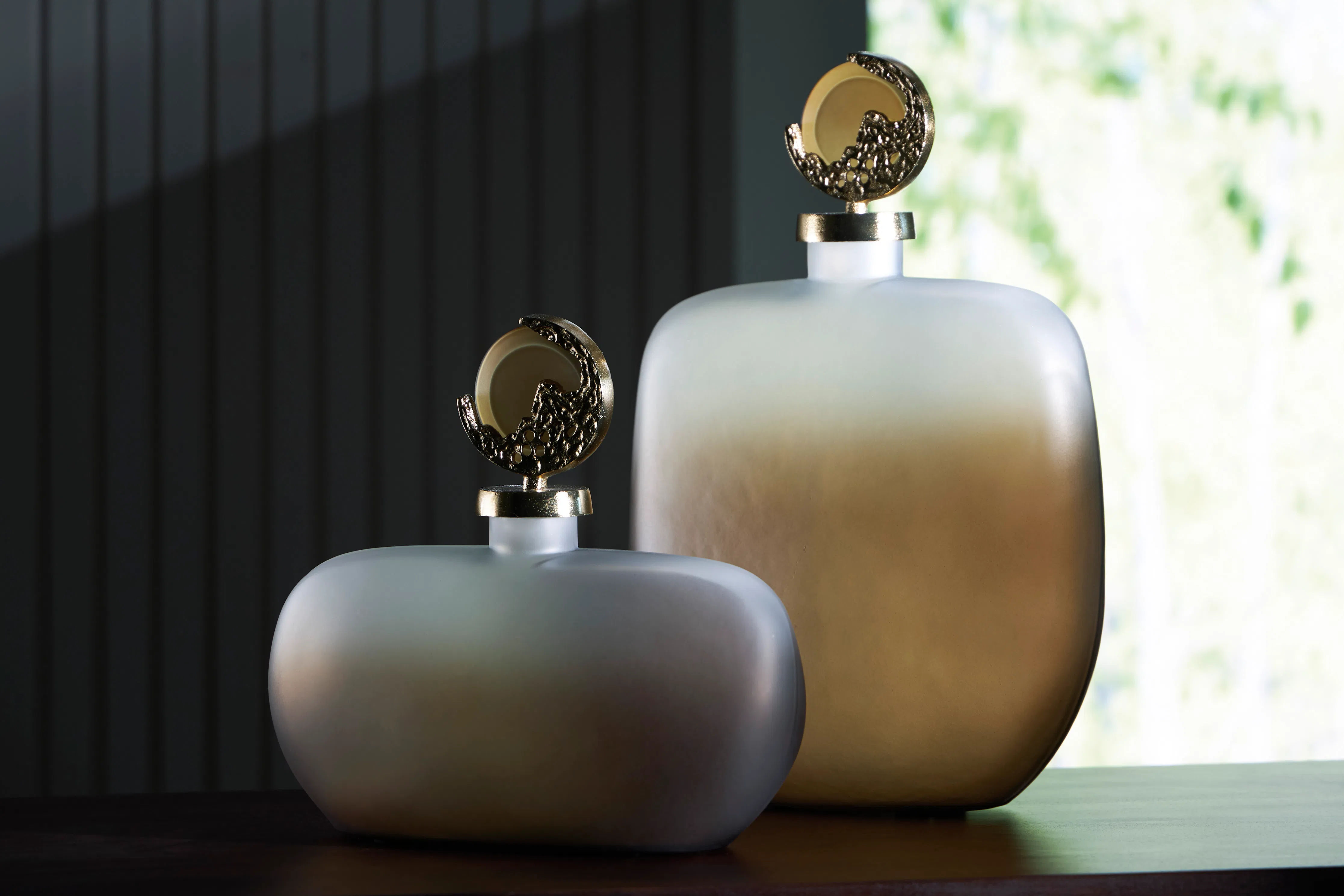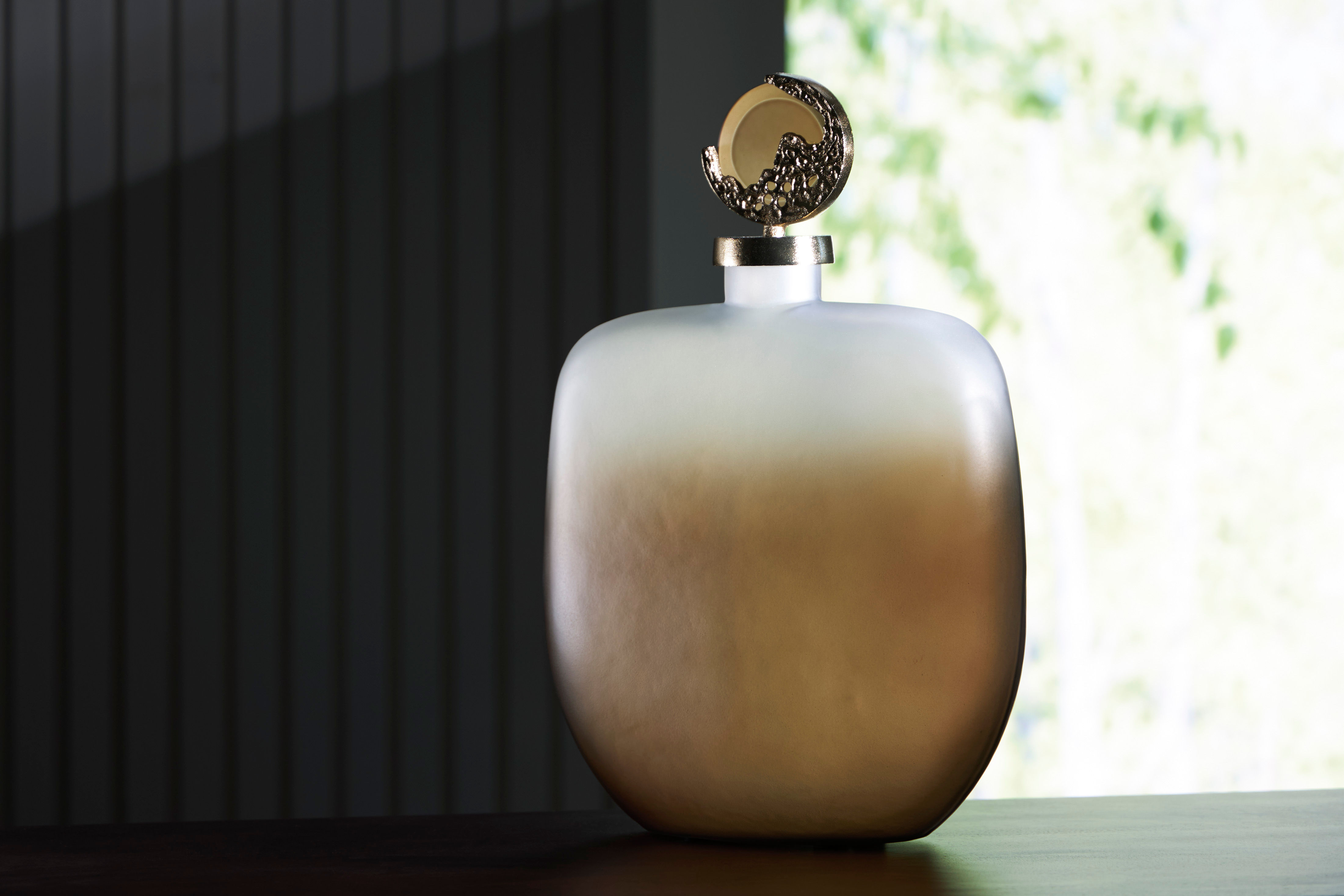 Showcase the traditional style of the Acario jar in your home. Made with an ombre effect of taupe finished frosted glass and cast aluminum with a gold finish. Due to the finishing process of this product, some variations may occur.