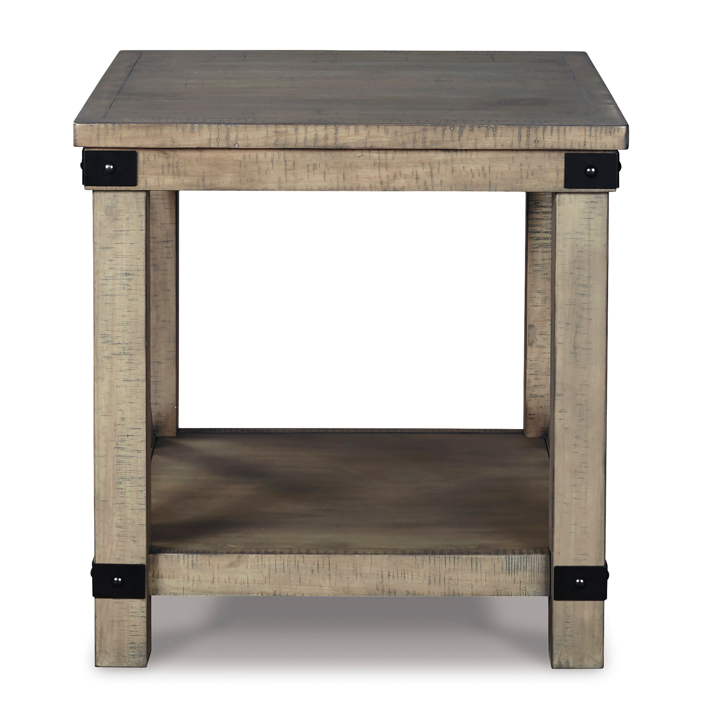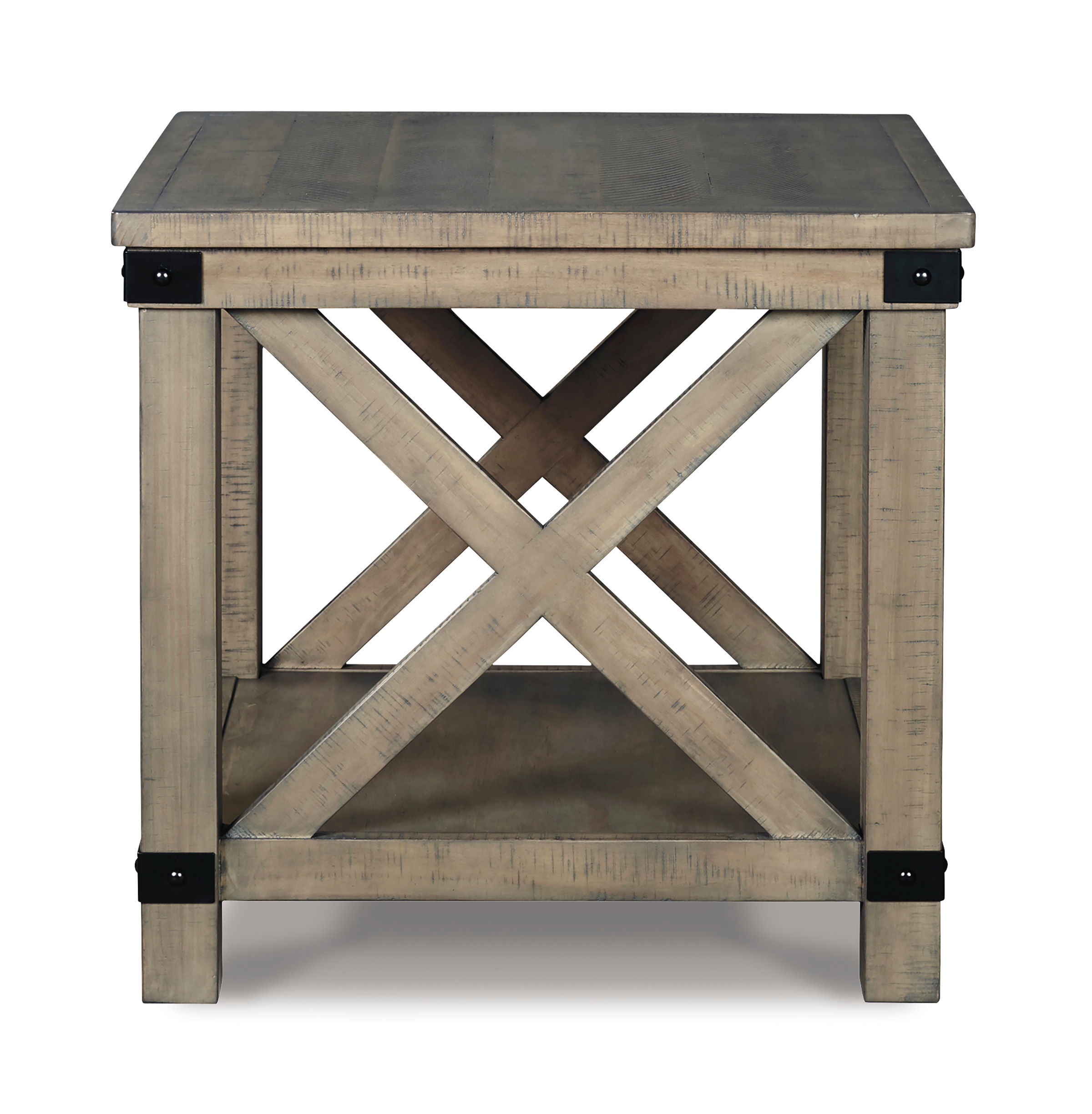 Crafted with solid pine wood treated to a weathered gray finish, the Aldwin end table is rustic farmhouse living at its best. Crossbuck styling adds striking flair. Metal industrial brackets incorporate an industrial twist.