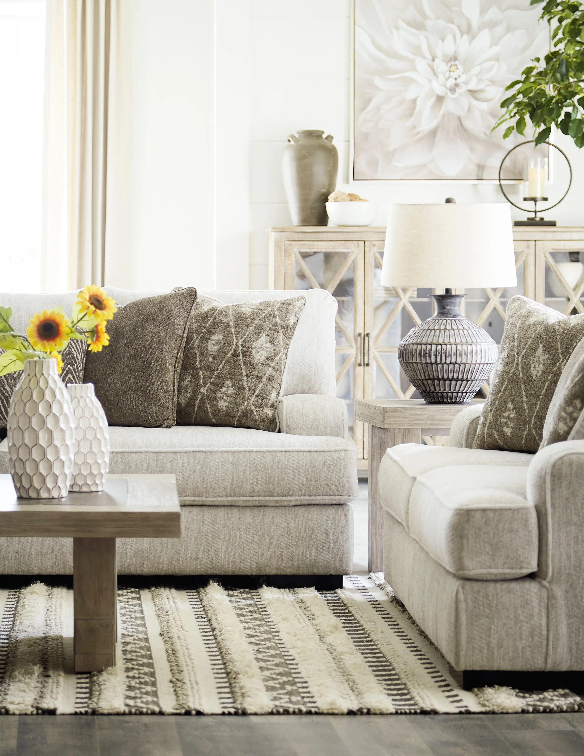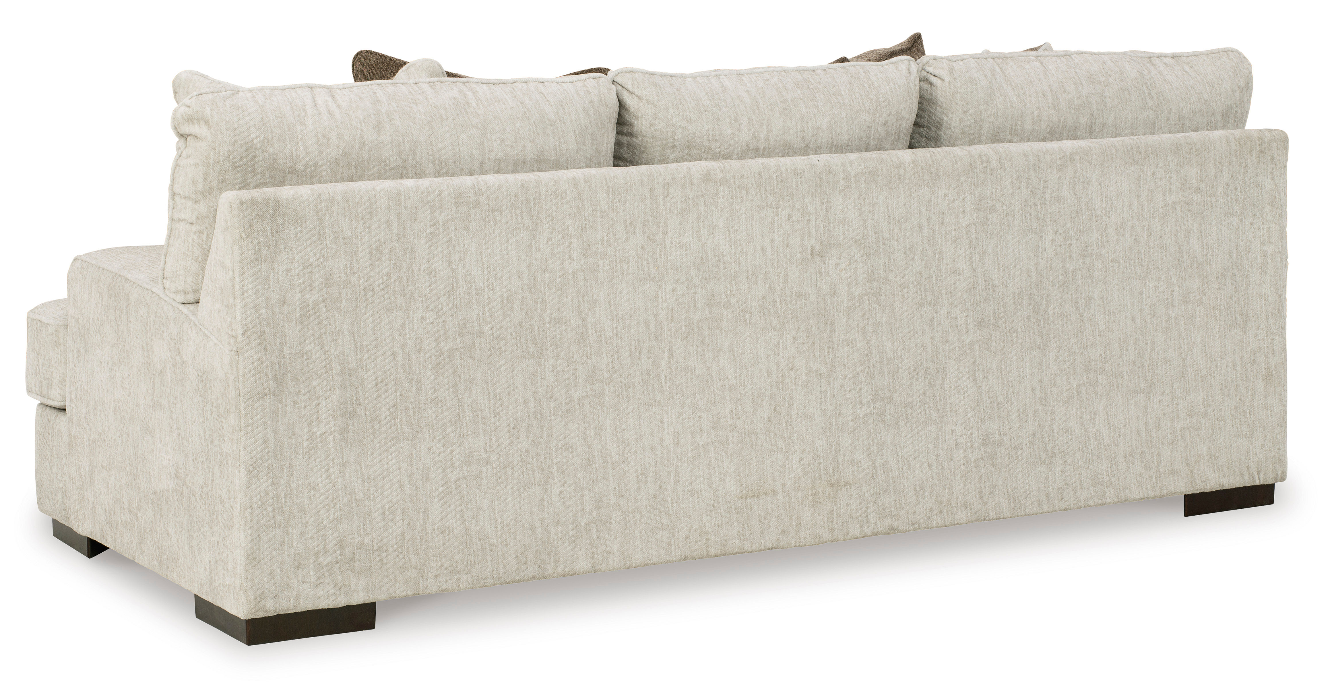 Decidedly modern with a sense of relaxed ease, the Alesandra sofa looks at home in so many different places and spaces. Providing a highly distinctive look: substantial track arms with curved cornering, wrapped t-cushions and low-to-the-floor block feet in a warm wood-tone finish. Sporting a subtle chevron texture, the parchment-tone upholstery takes neutral to new heights.