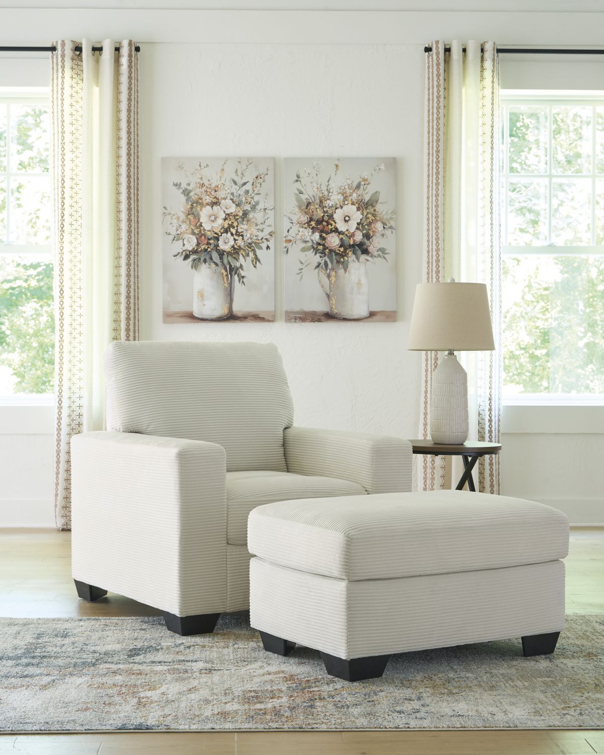 The crisp neutral hue and striking design details of this ottoman create a living room that expertly reflects your modern taste. For irresistibly cool textural appeal, the ultra-soft fabric is enhanced by a small-scale corded look. With a clean-lined silhouette, this ottoman allows you to take a trend-right approach to everyday living.