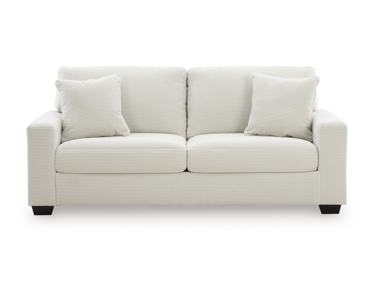 The crisp neutral hue and striking design details of this sofa create a living room that expertly reflects your contemporary taste. For irresistibly cool textural appeal, the ultra-soft fabric is enhanced by a small-scale corded look. With a clean-lined silhouette complete with track arms, this sofa allows you to take a trend-right approach to everyday living.