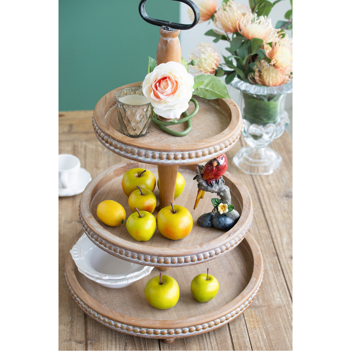 With its rich, natural brown hue, three-tiered silhouette, and artistic beaded pattern on the rim of each tray, this decorative stand blends farmhouse style with versatile function. Whether it is used to serve canapes to guests, to display cakes and fruit, or as a pedestal for antiques, it will thrive all the same. The soft brown hue ensures this piece will slot into any interior style.