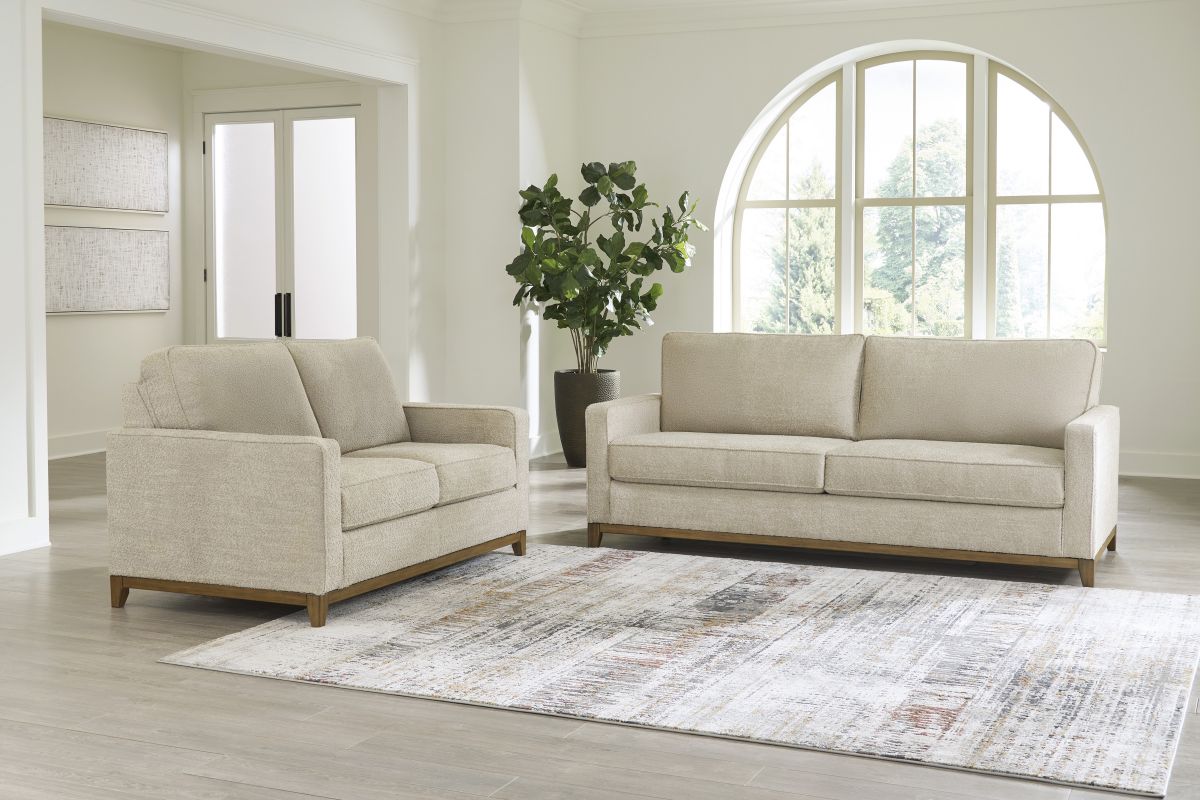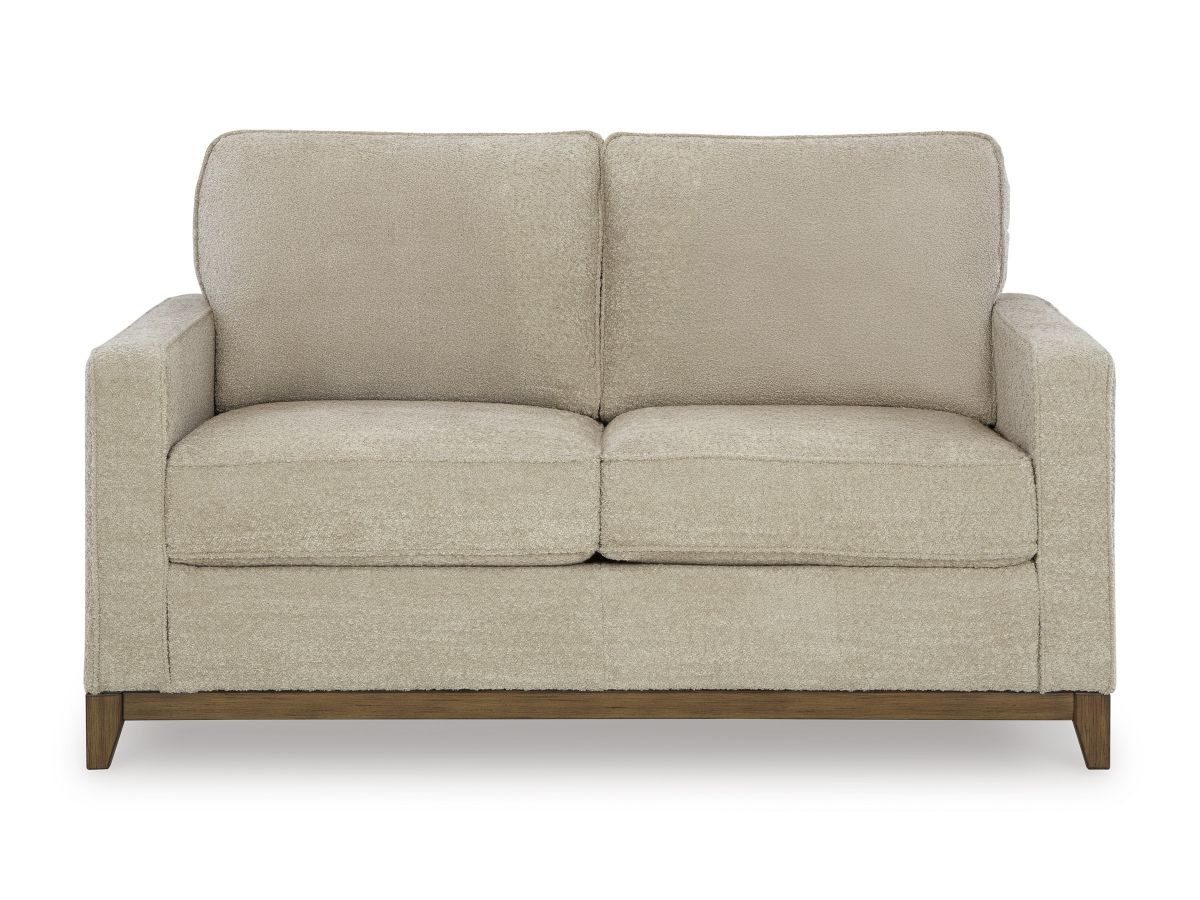 Discover the true meaning of a clean-lined design with the Arendale Loveseat. This perfectly neutral loveseat features a beige fabric upholstery that will blend in with your existing decor with ease and a wooden base in a brown finish. Comfort and style go hand-in-hand with this loveseat thanks to the plush cushioning on the seats and backs and it's contemporary charm.
