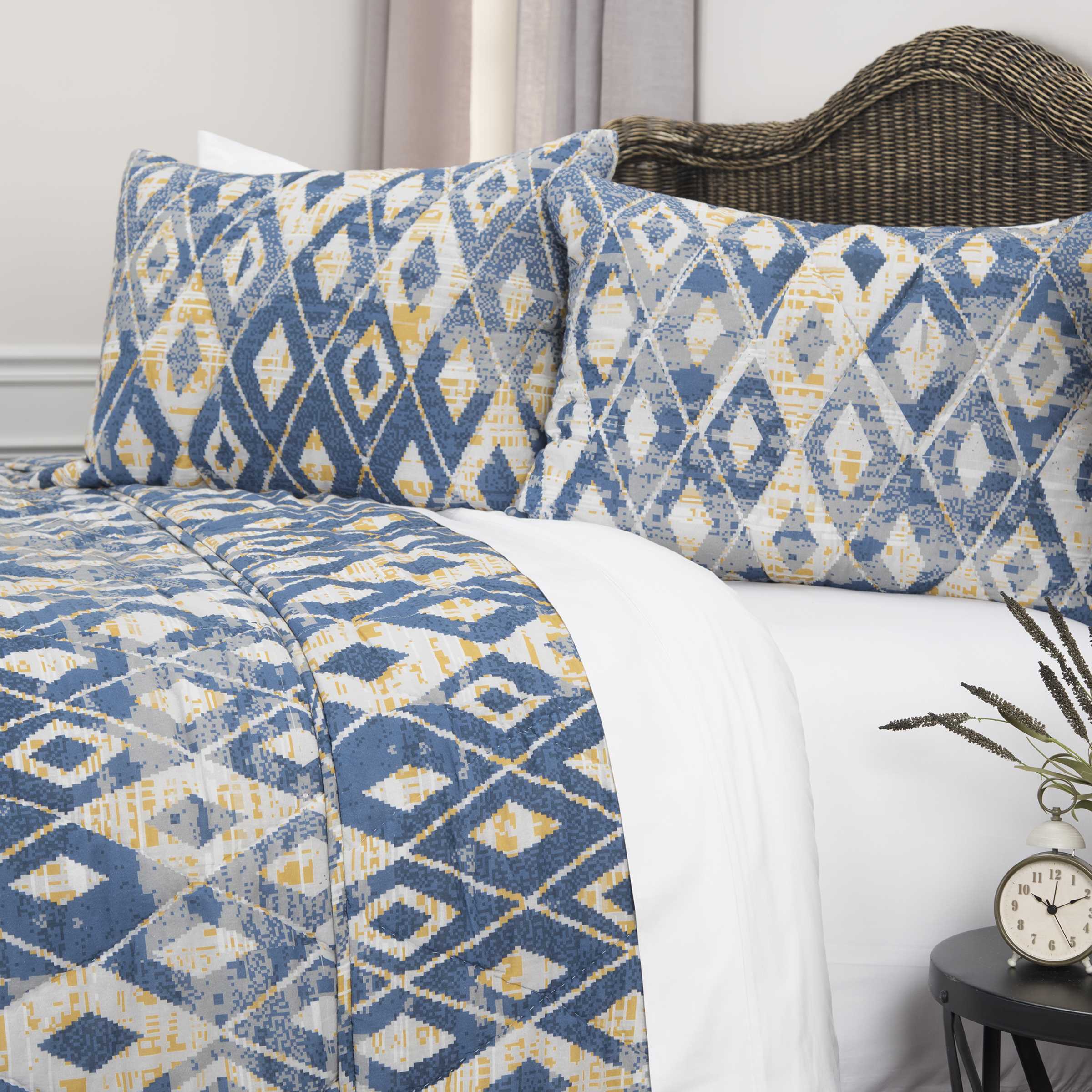 Embrace the modern style and comfort with the Asher queen quilt from Rizzy Home. Made with a calming color palette in mind, the Asher queen quilt features shades of blue and yellow.