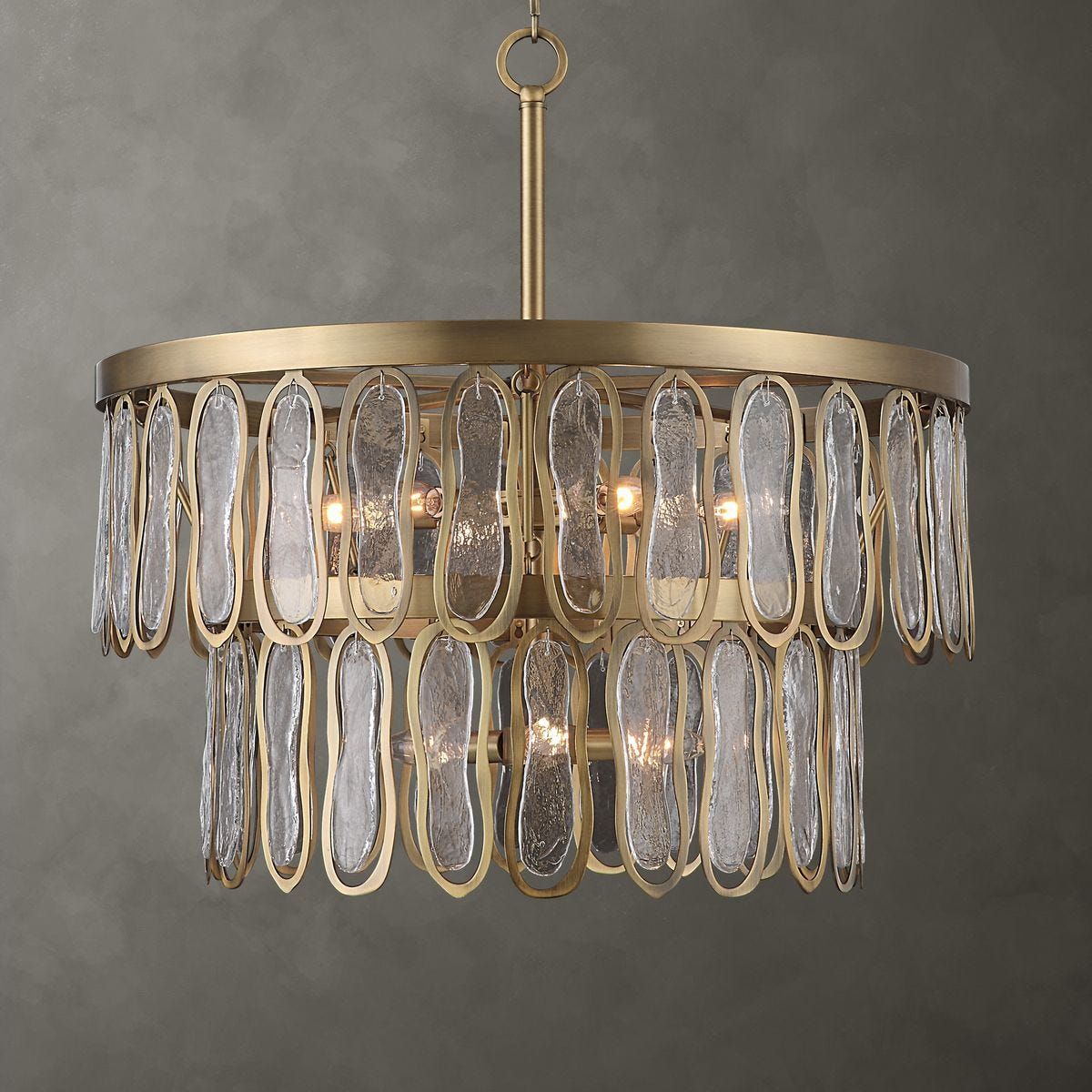 This two tier stacked 9 Lt Pendant is both artistic and stylish featuring organic watered and seeded clear glass accents outlined with a rich antique brass contours. The cleverly simple frame has the same rich antique brass finish. 9-60 watt max candelabra sockets. Bulbs not included. Supplied with 15' wire, 7' chain for adjustable installation.