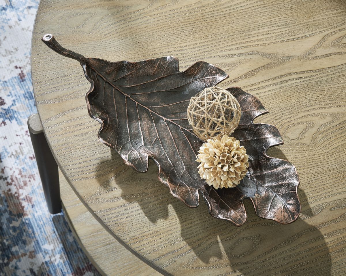 This sculpture brings a nature-inspired element to a bookshelf, desk or coffee table. With its leaf design, the copper-tone cast aluminum piece is a delightful nod to the tropics.
