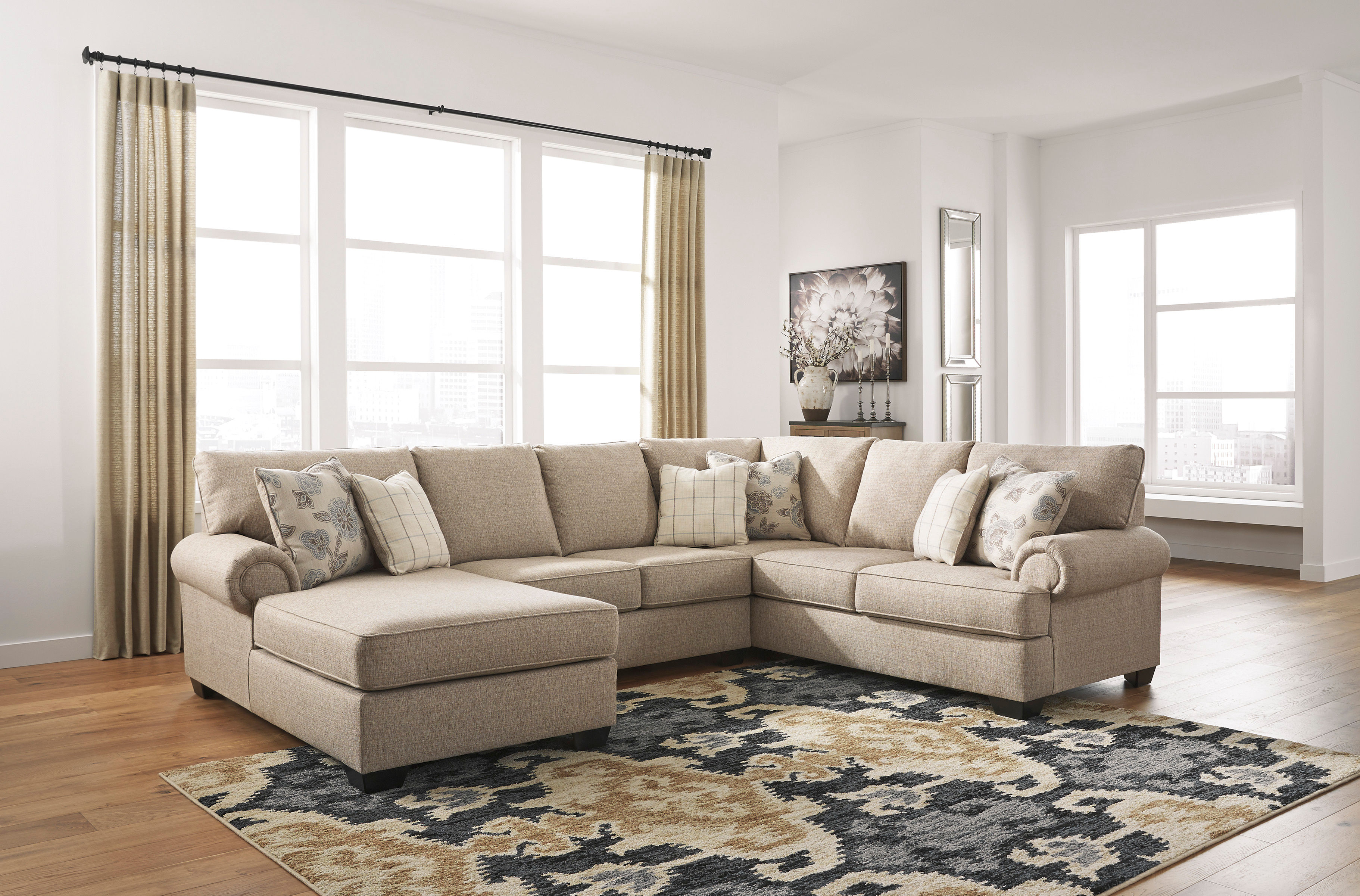Lighten things up in a comfortably chic way with the Baceno 3-piece sectional in “hemp” beige. Traditional elements such as t-cushion styling and prominent piping are modified with slanted roll arms for a beautiful balance of classic and contemporary. Linen-weave textural fabric is paired with posh designer pillows that truly perfect the look.