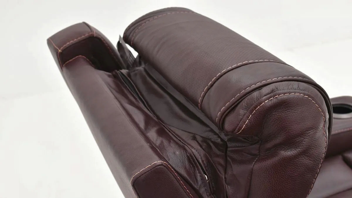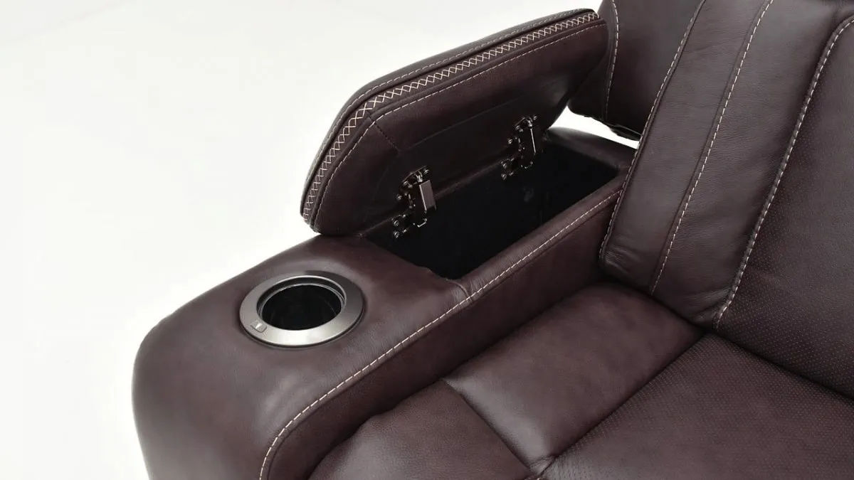 Experience luxury with the Bentley power recliner in real brown leather upholstery. The plush cushioning, adjustable headrest, and hidden storage in the armrests and cupholsters elevate your comfort and convenience by keeping everything you need by you. This modern power recliner features USB charging so you can continue binge-watching your favorite shows.
