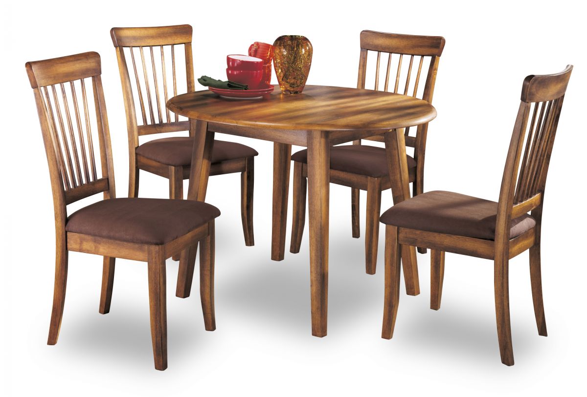 The Berringer 5-piece dining room set incorporates decidedly rustic flair. The table’s two drop leaves provide just enough table space to accommodate the drop-in guest. Simple and clean lined, with stylish stilted legs, it’s a look that easily fits, whether your aesthetic is vintage, country or traditional. Upholstered side chair has a classic spindle back and seat covered in easy-to-maintain microfiber.