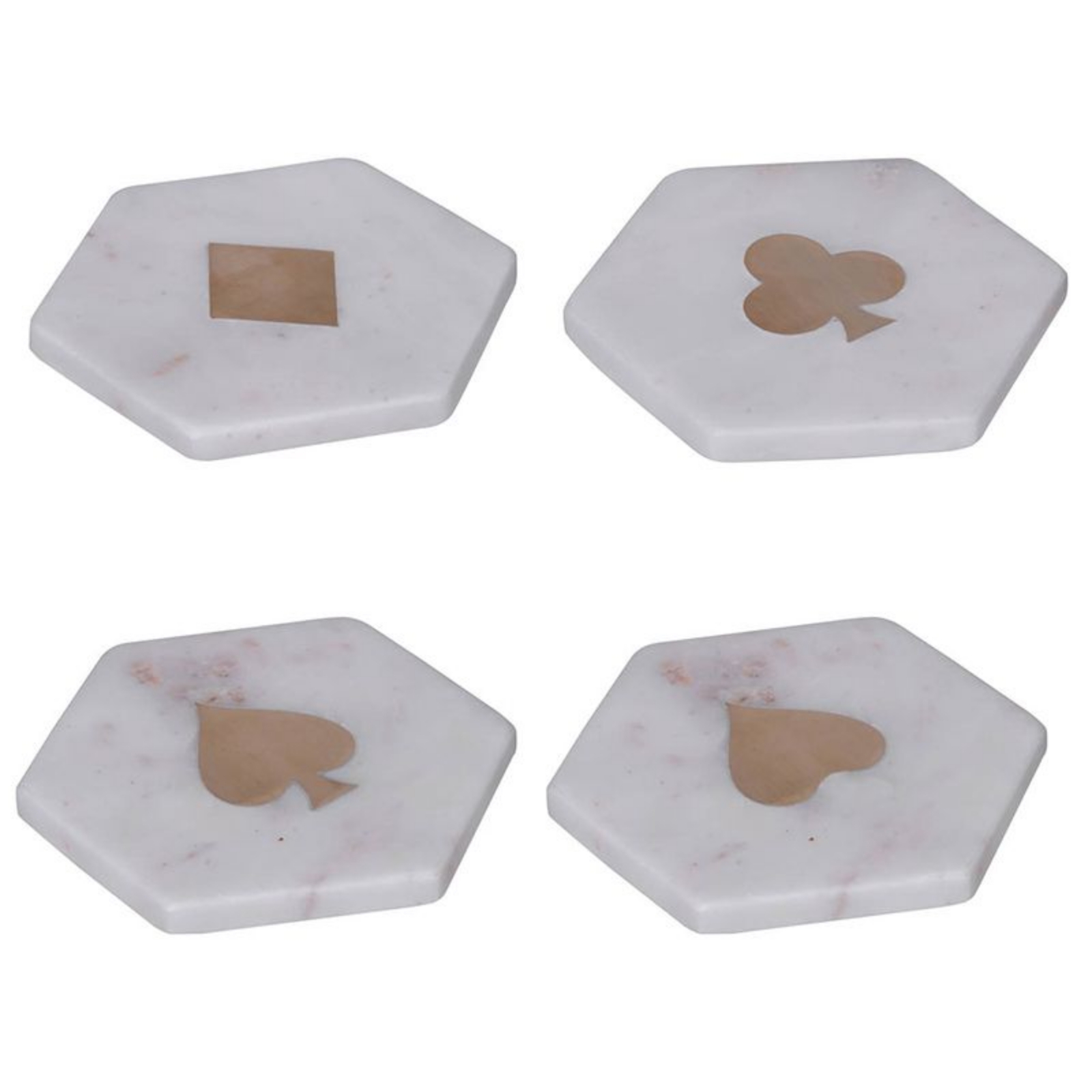 The Binswara coaster seat features 4 different coasters, each made to look like white marble with a different symbol from playing cards in the middle. Made with a neutral color scheme, this coaster set won't clash with any of your existing decor.