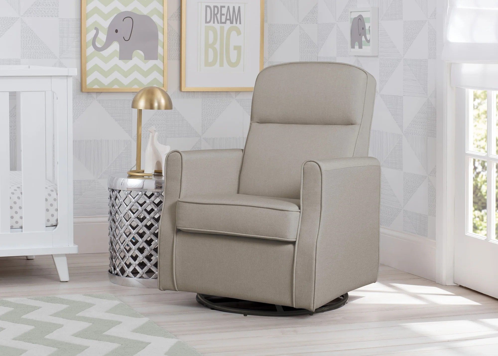 The Blair Slim Nursery Glider Swivel Rocker Chair from Delta Children allows you to sink-in and snuggle up with your baby, no matter how much floor space you have available. This glider features a striking, curved silhouette that stands up to real life - it’s upholstered in durable woven fabric that is easy to clean. The smaller footprint of this petite glider helps you maximize every square inch without sacrificing comfort. The chair’s smooth, built-in gliding and swivel system allows you to rock and relax with your little one for years to come.