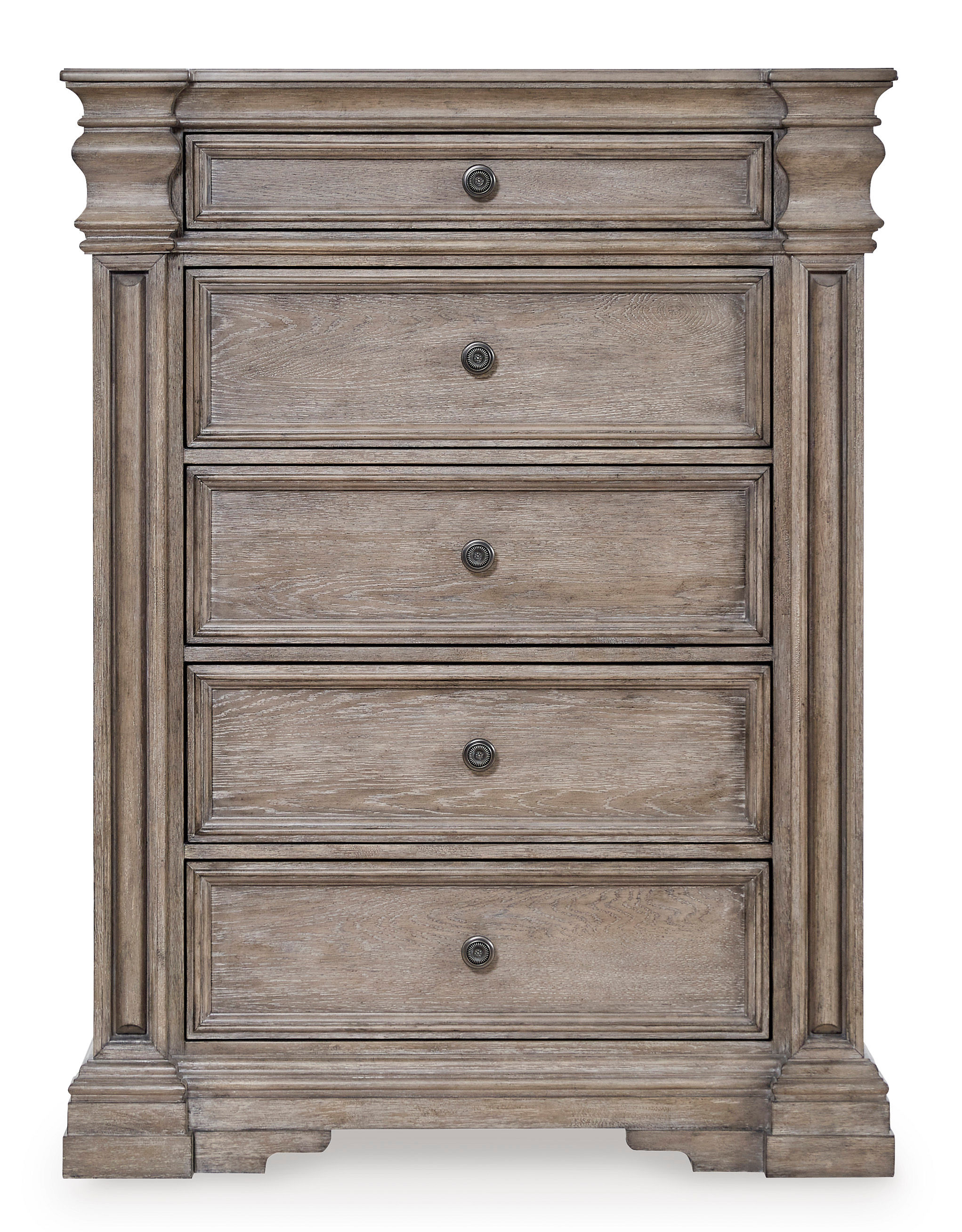 Discover something exceptional with the Blairhurst chest of drawers. Its impressive silhouette offers a casual traditional aesthetic, embodied by classic-inspired columns and a relaxed grayish brown finish. Casually cool drawers with inset framed fronts are packed with ample storage possibilities.