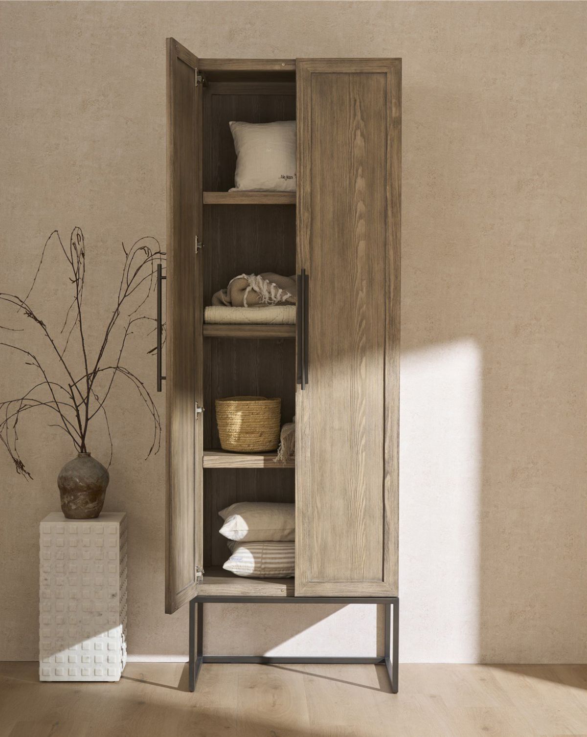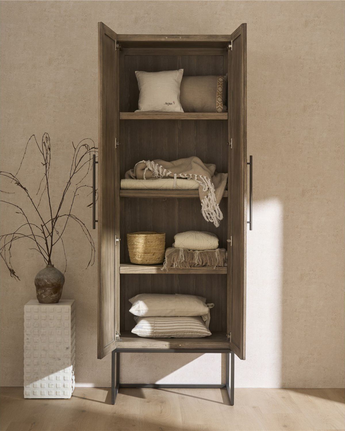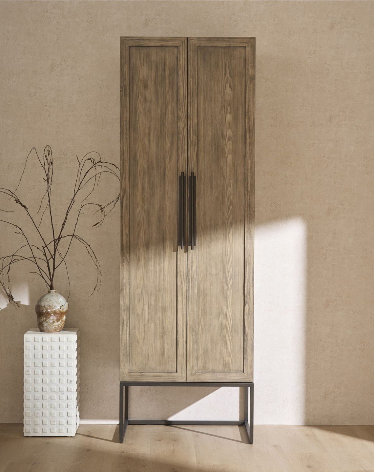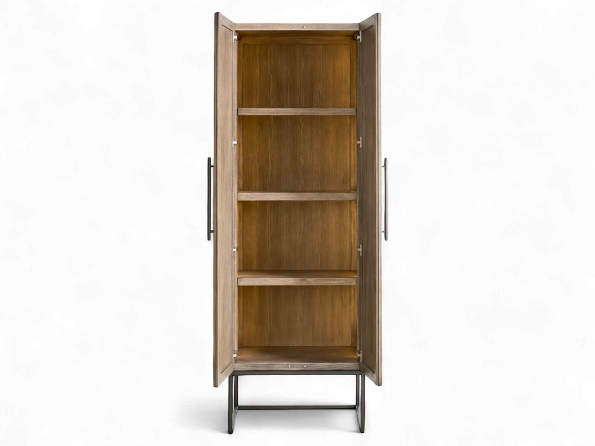 Showcasing a warm Boulder medium-brown finish, the Utility Cabinet brings refined storage to any room. Its sleek metal base elevates adjustable wood shelves, accented with inset glass, offering a blend of modern design and practical display. This piece adds a touch of architectural sophistication, making it a versatile and stylish addition to your home.
