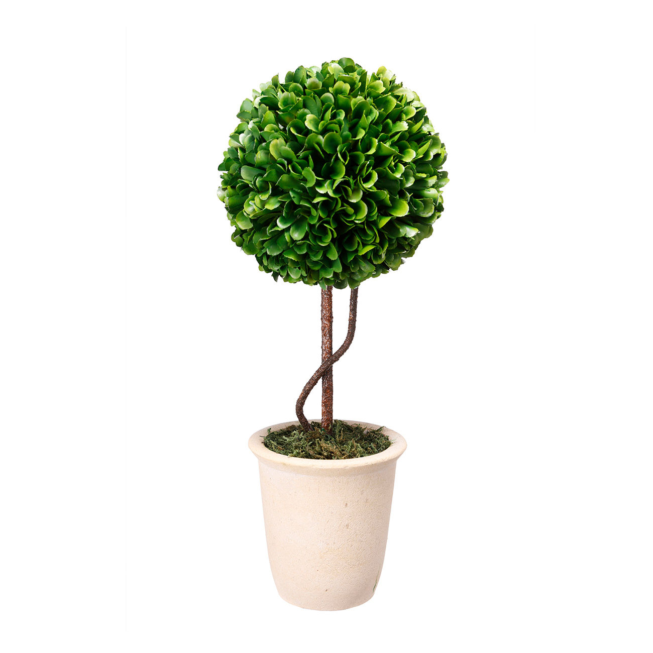 Offering all the benefits of a natural boxwood topiary without the constant upkeep headaches, this faux alternative brings a low-maintenance boost to your home or office. Housed in a sleek white pot, it will effortlessly complement any interior theme, making it a versatile addition to any space. Enhancing its natural appeal, the pot features faux soil and a soft white finish, allowing this boxwood to effortlessly complement traditional, French Country, and bohemian decor.