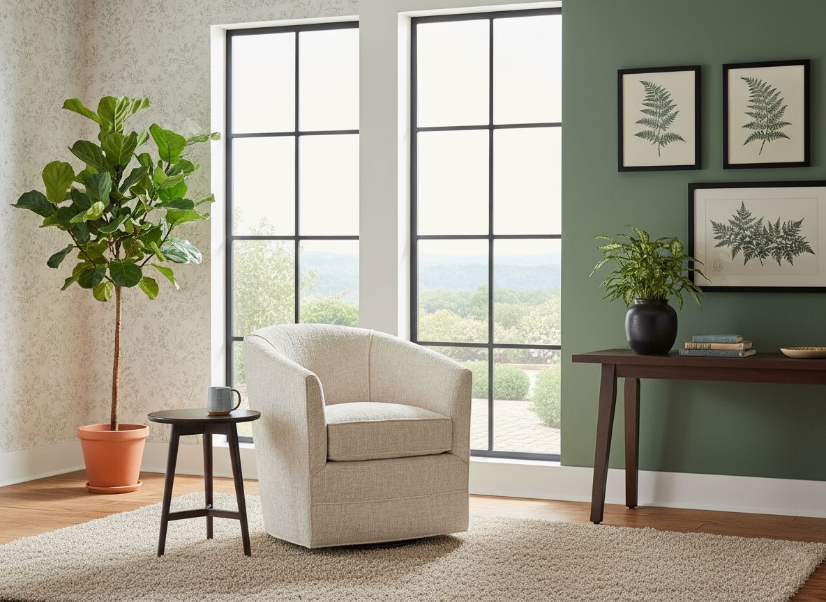 The Burke swivel chair features a modern, rounded design with a cozy, enveloping backrest and arms that create a comfortable seating experience. Upholstered in a textured, neutral beige fabric, the chair exudes a subtle elegance that can easily blend into various interior styles. The cushioned seat offers plush support, while the swivel base adds functionality and ease of movement, making it an ideal choice for both relaxation and practical use in living rooms, bedrooms, or office spaces.