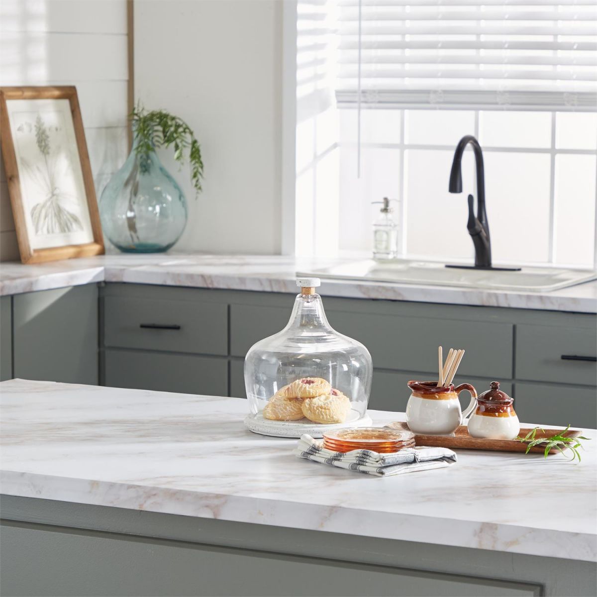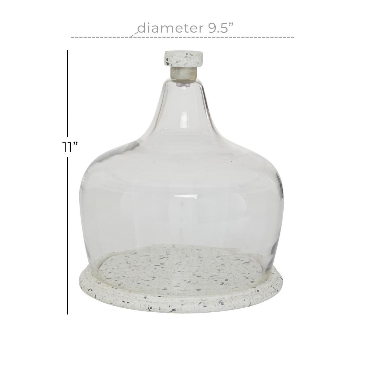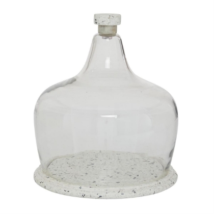 A contemporary style offers neutral elements and basic forms with a bold design. Contemporary style inspired design cloche is made from stoneware and glass materials. Stoneware and glass cloche comes in a neutral white stoneware finish. Contemporary design white stoneware and glass cloche features a round terrazzo base with beautiful stone fragments patterns furnished with a glass dome lid topped with a wood and stoneware handle.