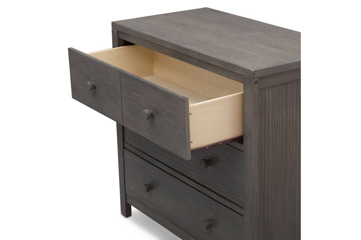 The rustic, extra-roomy Cambridge 3 Drawer Dresser with Interlocking Drawers by Delta Children features a unique textured finish that allows for the deep grain of the wood to show through. Designed to coordinate with the Cambridge Crib or any other Delta Children crib in the same finish, the Cambridge 3 Drawer Dresser with Interlocking Drawers always allows you to achieve a well-coordinated look. For your child’s safety, this dresser is outfitted with an interlocking drawer system that limits the number of drawers that can be opened at one time. This Delta Children dresser is tested to meet the current requirements of ASTM F2057, the mandatory CPSC safety standard that protects young children from furniture tip-over incidents. For your children’s safety, only purchase dressers that comply with this standard. For additional security, Delta Children strongly recommends that all dressers in your home be anchored; all Delta dressers include a wall anchor. To learn how to properly secure your dresser, please see the product assembly instructions or visit our website.
