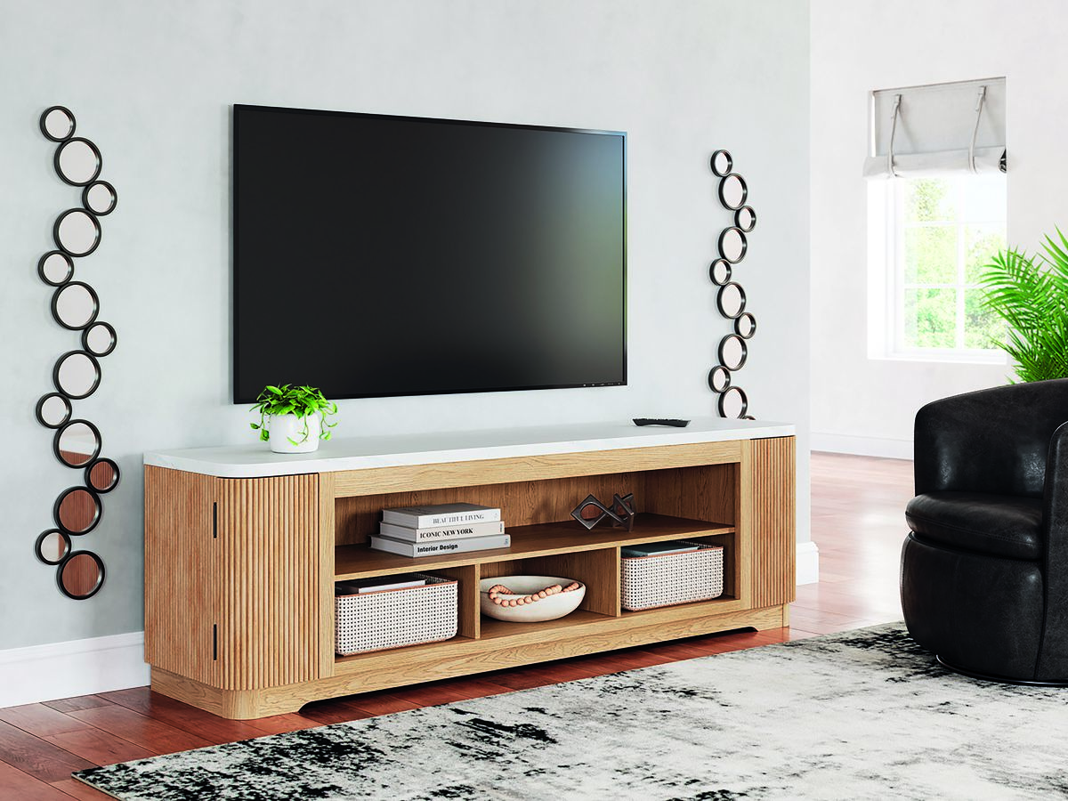 Elegance meets earthy charm in this TV stand. Crafting a contemporary living room? The faux marble top expertly pairs with the reeded base for a trend-right take on day-to-day function. Open shelving and subtly integrated storage cabinets make it easy to store and display media accessories in style.