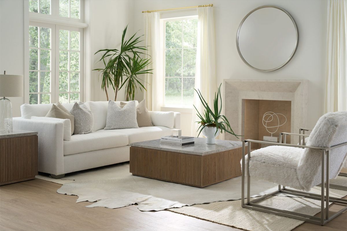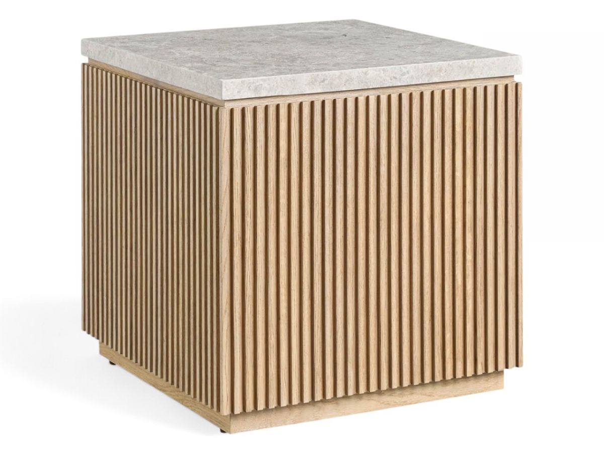 The Carmen Side Table, a striking piece of furniture, combines sleek lines with a unique square silhouette. Its textured, vertical design, reminiscent of natural elements, is juxtaposed with a smooth stone top. This captivating contrast and its versatile design make it a perfect addition to any interior space.