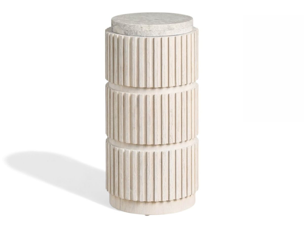 The Carmen Spot Table, a sleek and minimalist design, offers a unique blend of form and function. Its tall, slender silhouette, topped with a smooth stone surface, is perfect for holding a single drink or a small decorative object. The table's distinctive vertical texture adds a touch of elegance, making it a versatile piece for any room.