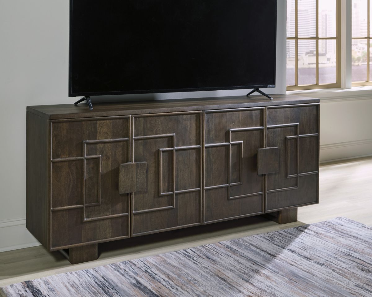 This accent cabinet is a stunning statement piece that combines artistry and functionality. A beautiful dark brown finish and raised geometric-patterned door fronts create a captivating look, while the spacious interior with two shelves offers ample storage. It's a perfect place to keep your essentials organized and out of sight.