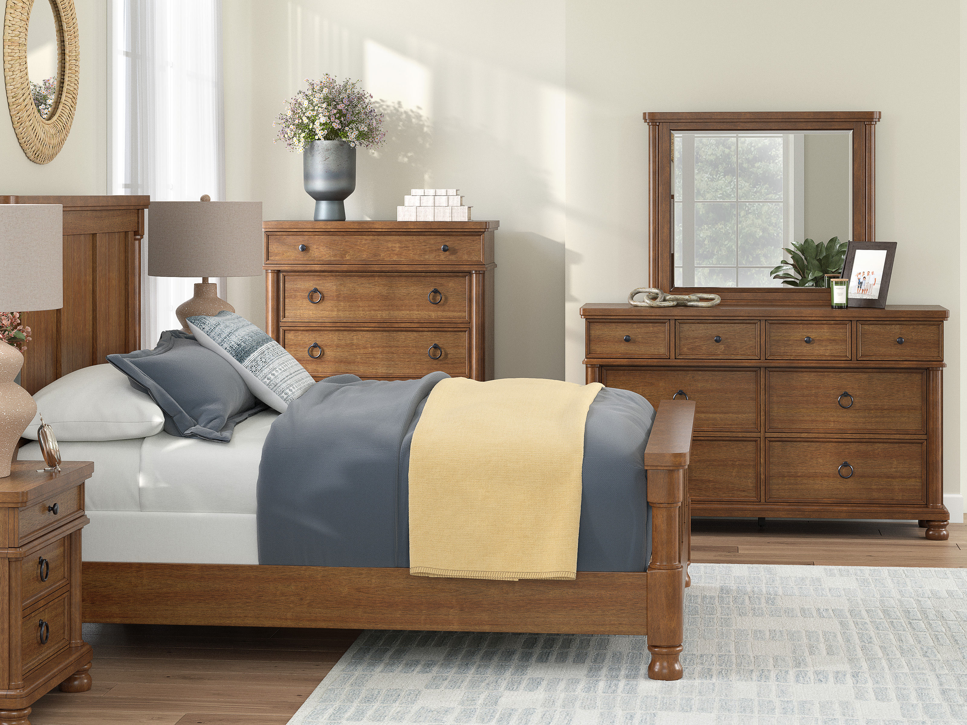Taking a laid-back approach to casual traditional design, this artfully crafted dresser combines classic elements with a clean modern approach. Its rich medium brown wood tone exudes a comfy, timeless appeal that's sure to carry you away to a dreamy time and place. Simple round metal knobs and ring pulls on the dresser's spacious drawers make just the right statement.