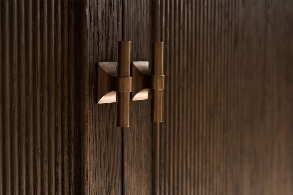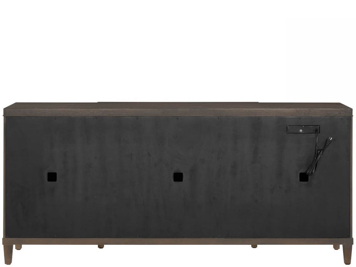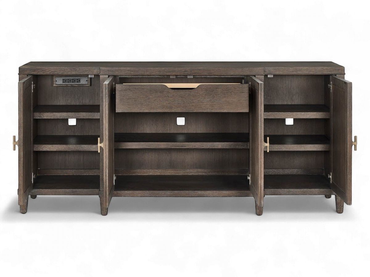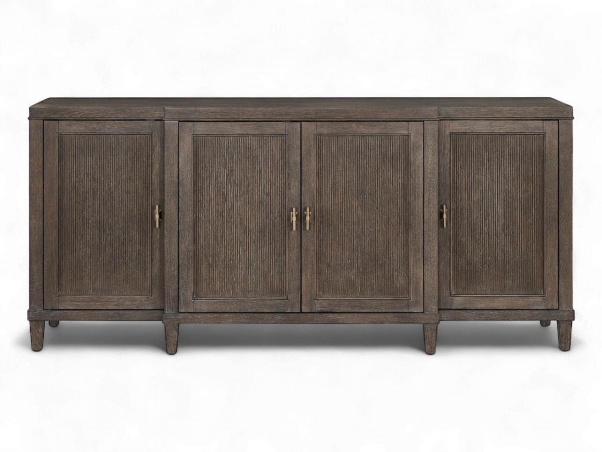 The Cocoa Credenza offers exceptional dining room storage with reeded door fronts that add textural dimension to clean aesthetic lines. This substantial piece features a felt-lined silverware tray, adjustable shelving, and integrated wire management with a power supply bar for modern functionality.