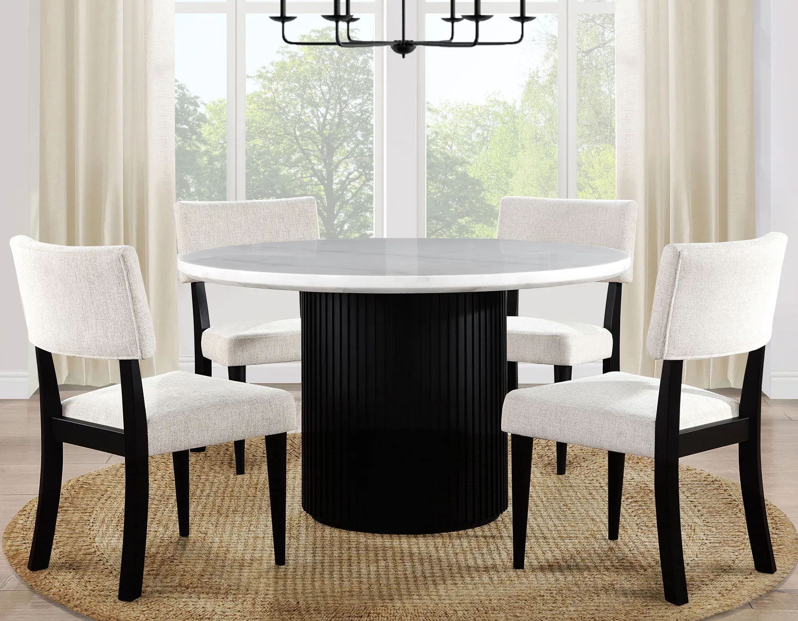 Add a touch of sophistication to your dining experience with the 52″ round Colvin white marble dining table and four Colvin black side chairs in this elegant five-piece set. The table features a lustrous white marble top with veins and marbling that accent the reeded black base, seating up to six and creating a welcoming ambiance. Inspired by Art Deco and Empire styling, it is finished in lustrous black over oak and mango veneers, radiating warmth and beauty. The Colvin Side Chair offers elegant comfort with an eggshell polyester cover, a box seat, a shaped back, and black tapered legs. Built for lasting durability, these chairs ensure a stylish and sturdy addition to your home.