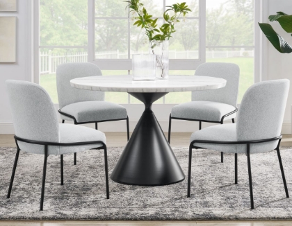 The Conrad 48″ Round White Marble Top 5-Piece Dining Set combines modern elegance and functionality. The table features a 1.5-inch marble veneer top with a black conical base, blending sleek sophistication with bold design. It comfortably seats four, perfect for intimate gatherings or everyday dining. Paired with four Conrad Black Leg Cushioned Side Chairs, each offering a shaped back, easy-to-clean polyester cover, and a black-finished stainless steel base, this set adds contemporary flair and lasting comfort, making it an ideal addition to any dining room.