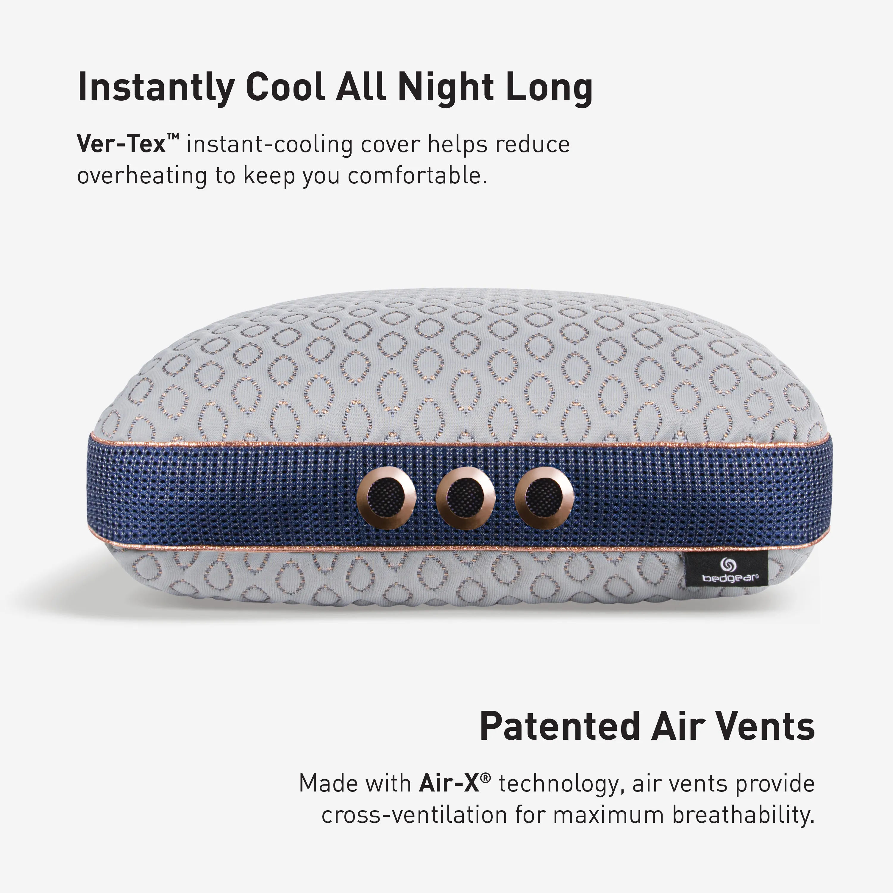 The sporty Cosmo pillow gives you the best of both worlds - soft on one side and firmer on the other. Adjust your comfort level each night simply by flipping over your pillow! The Ver-Tex® cover features instant cooling technology, that feels cool-to-the-touch, and Air-X® mesh panels, with air vents along the sides, reduce sweating and overheating.