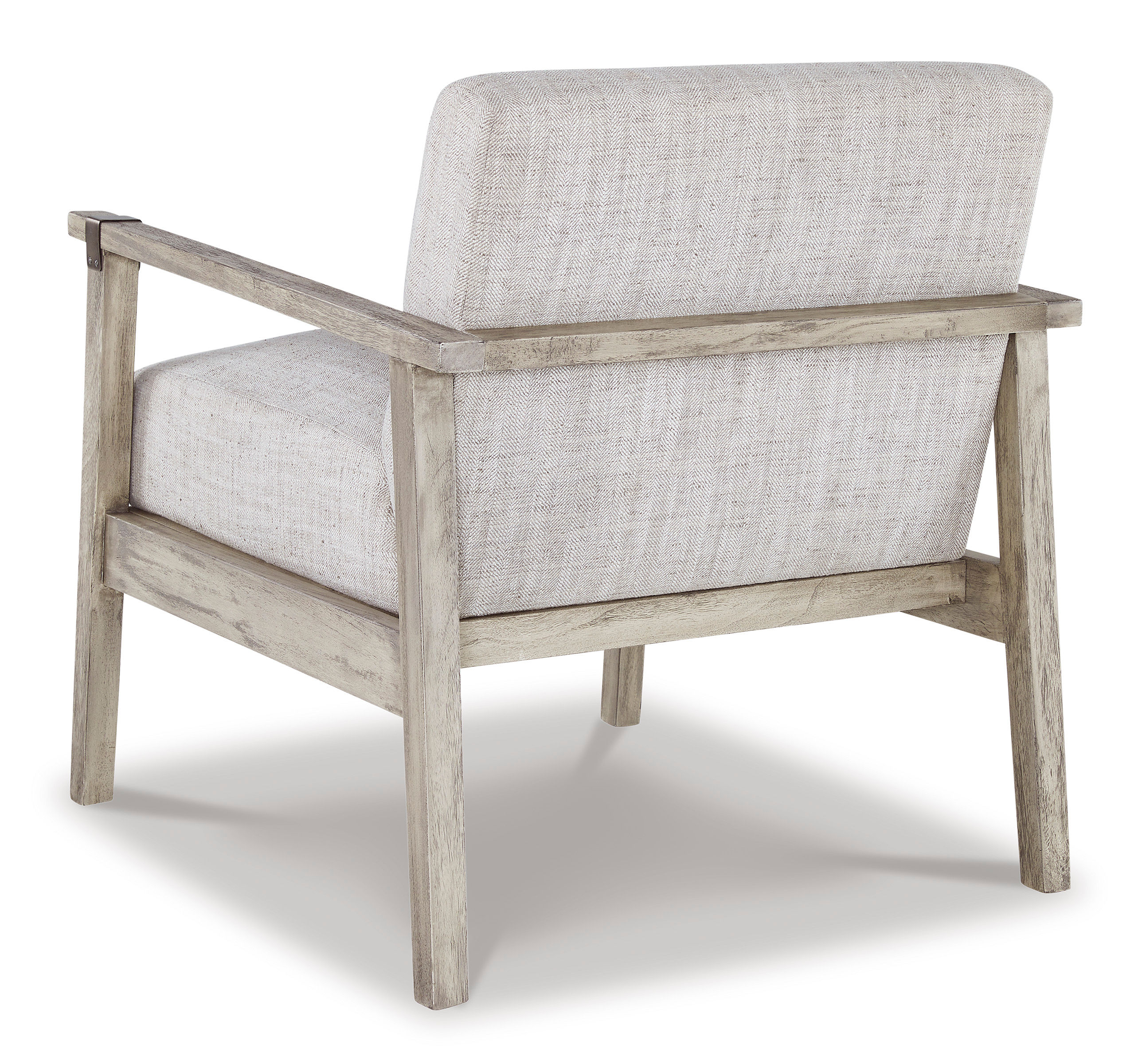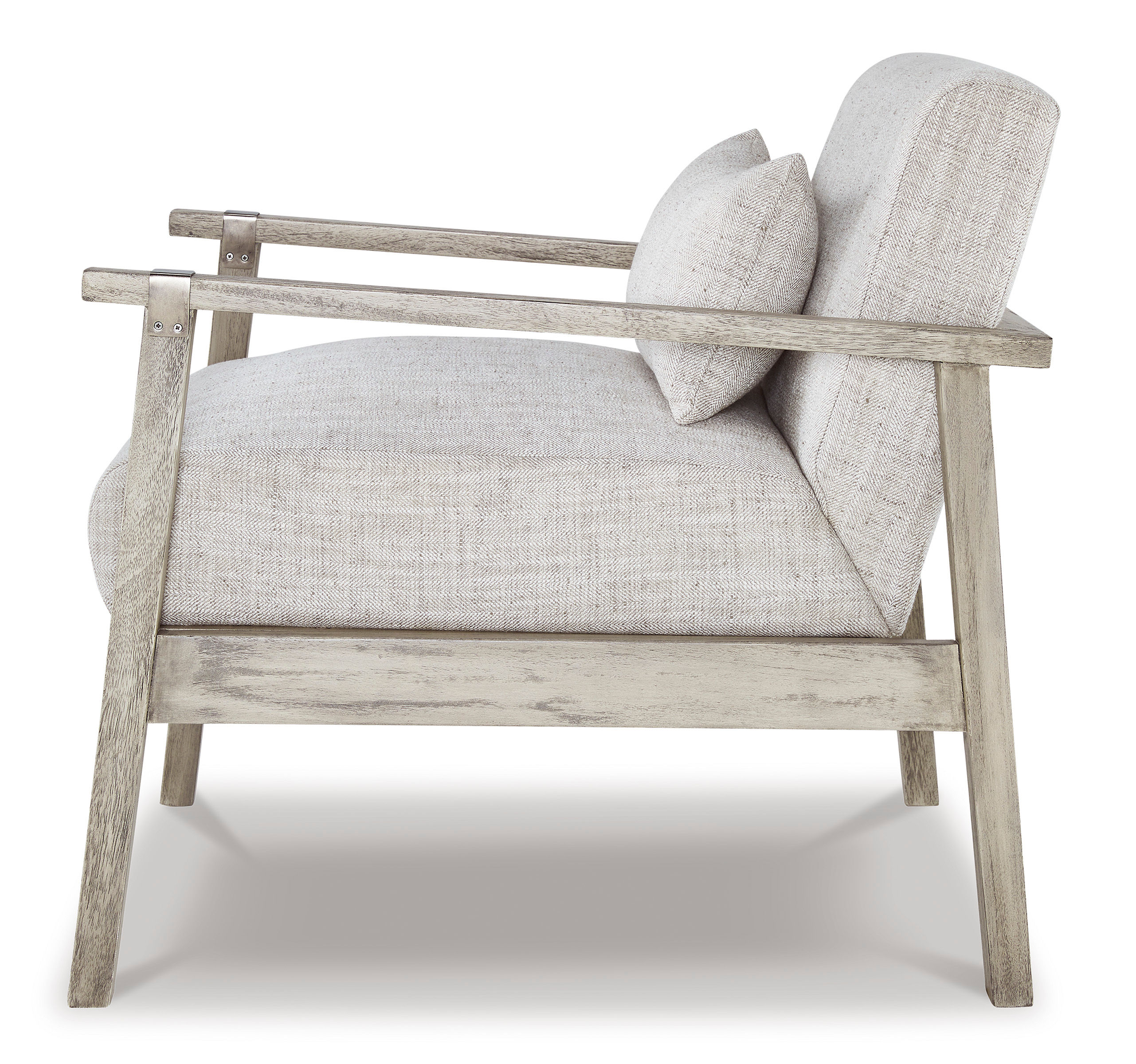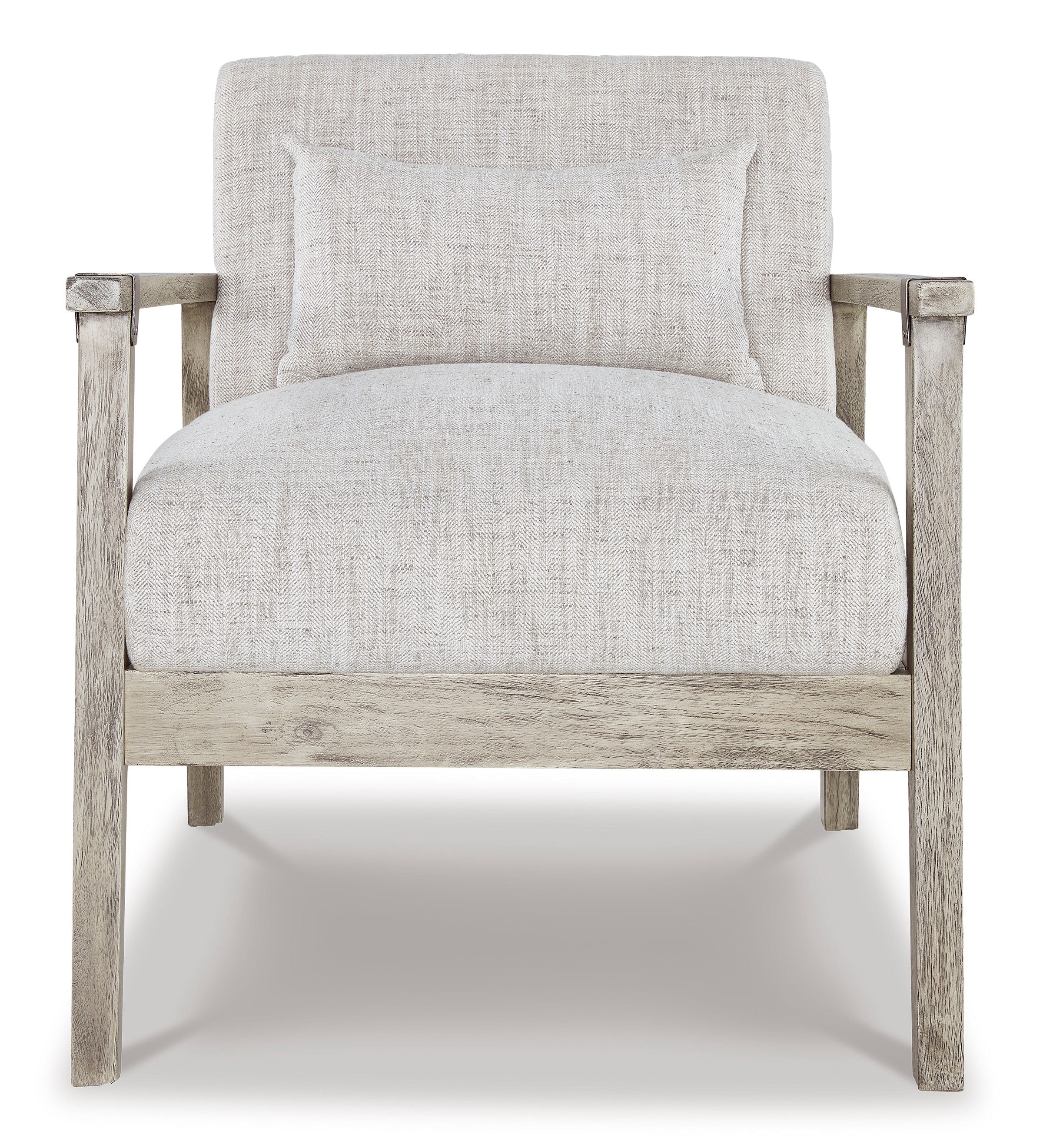 Keep your seating casually cool with the Dalenville accent chair. The clean-lined design sports a gray finish for a modern appeal, while light neutral upholstery in a herringbone pattern creates textural interest. Antiqued pewter-tone accents add a touch of urban flair, rounding out this relaxed take on contemporary style.
