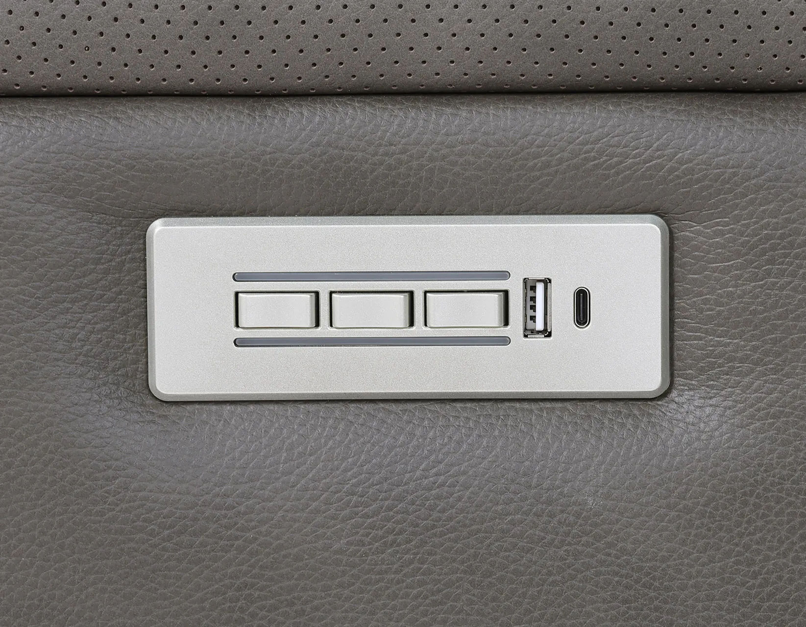 Experience the theater from the comfort of home with the Daniel Triple-Power Leather Immersive Entertainment Recliner with Built-in Speakers. Wrapped in plush, mossy-gray leather, this recliner is designed for immersive entertainment. Built-in speakers, a subwoofer, and vibration transponders surround you with lifelike sound, while air massage and soothing heat settings add next-level relaxation. Popup arms offer convenient bass, treble and vibration control, while the outer console has USB-A &C charging, integrated lighting and programmable memory settings. Enjoy the ultimate blend of luxury, comfort, and high-tech entertainment with the Daniel Triple-Power Leather Immersive Entertainment Recliner with Built-In Speakers.