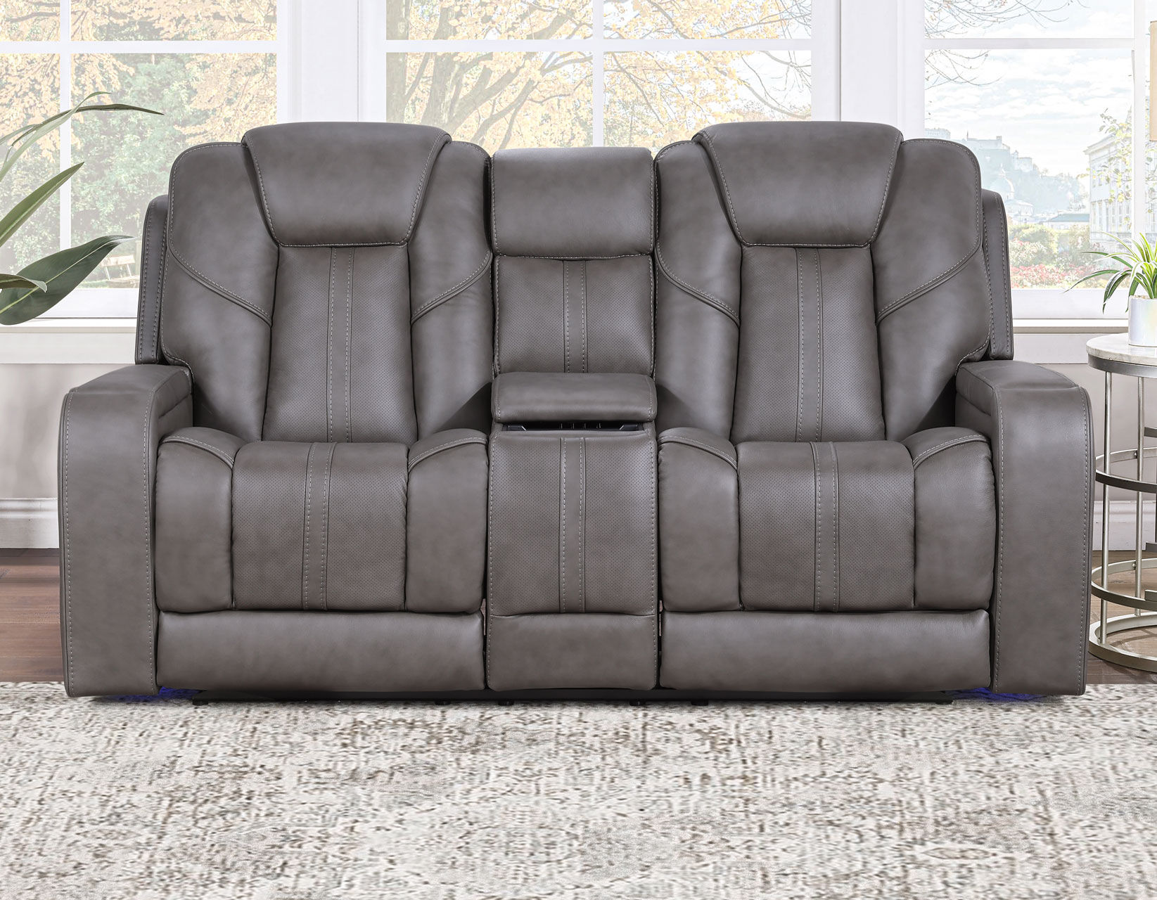 Experience the theater from the comfort of home with the Daniel Triple-Power Leather Reclining Immersive Entertainment Console Loveseat. Wrapped in plush, mossy-gray leather, this sofa is designed for immersive entertainment. Built-in speakers, a subwoofer, and vibration transponders surround you with lifelike sound, while air massage and soothing heat settings add next-level relaxation. A convenient center console offers wireless charging, USB-A &C charging, integrated lighting, easy-access controls and handy storage, keeping everything within reach. Enjoy the ultimate blend of luxury, comfort, and high-tech entertainment with the Daniel Triple-Power Leather Reclining Immersive Entertainment Console Loveseat.