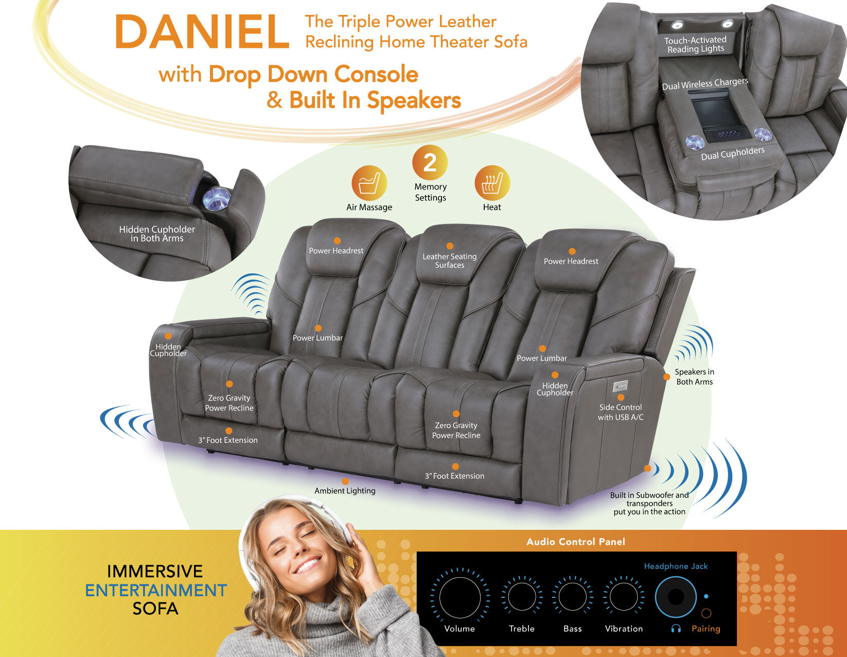 Experience the theater from the comfort of home with the Daniel Triple-Power Leather Reclining Sofa. Wrapped in plush, mossy-gray leather, this sofa is designed for immersive entertainment. Built-in speakers, a subwoofer, and vibration transponders surround you with lifelike sound, while air massage and soothing heat settings add next-level relaxation. A convenient drop-down console offers wireless charging, integrated lighting, and easy-access controls, keeping everything within reach. Enjoy the ultimate blend of luxury, comfort, and high-tech entertainment with the Daniel Triple-Power Leather Reclining Sofa.