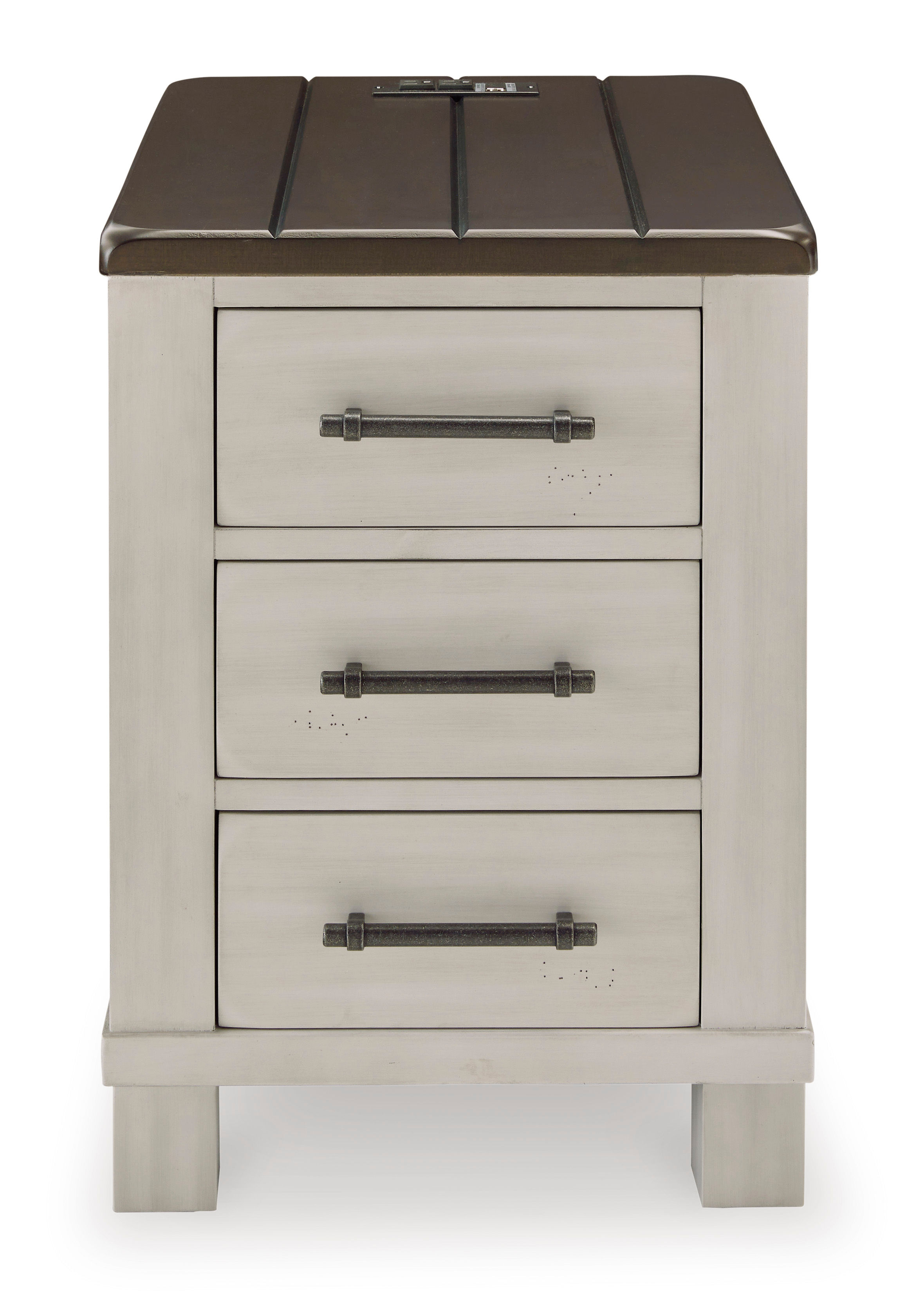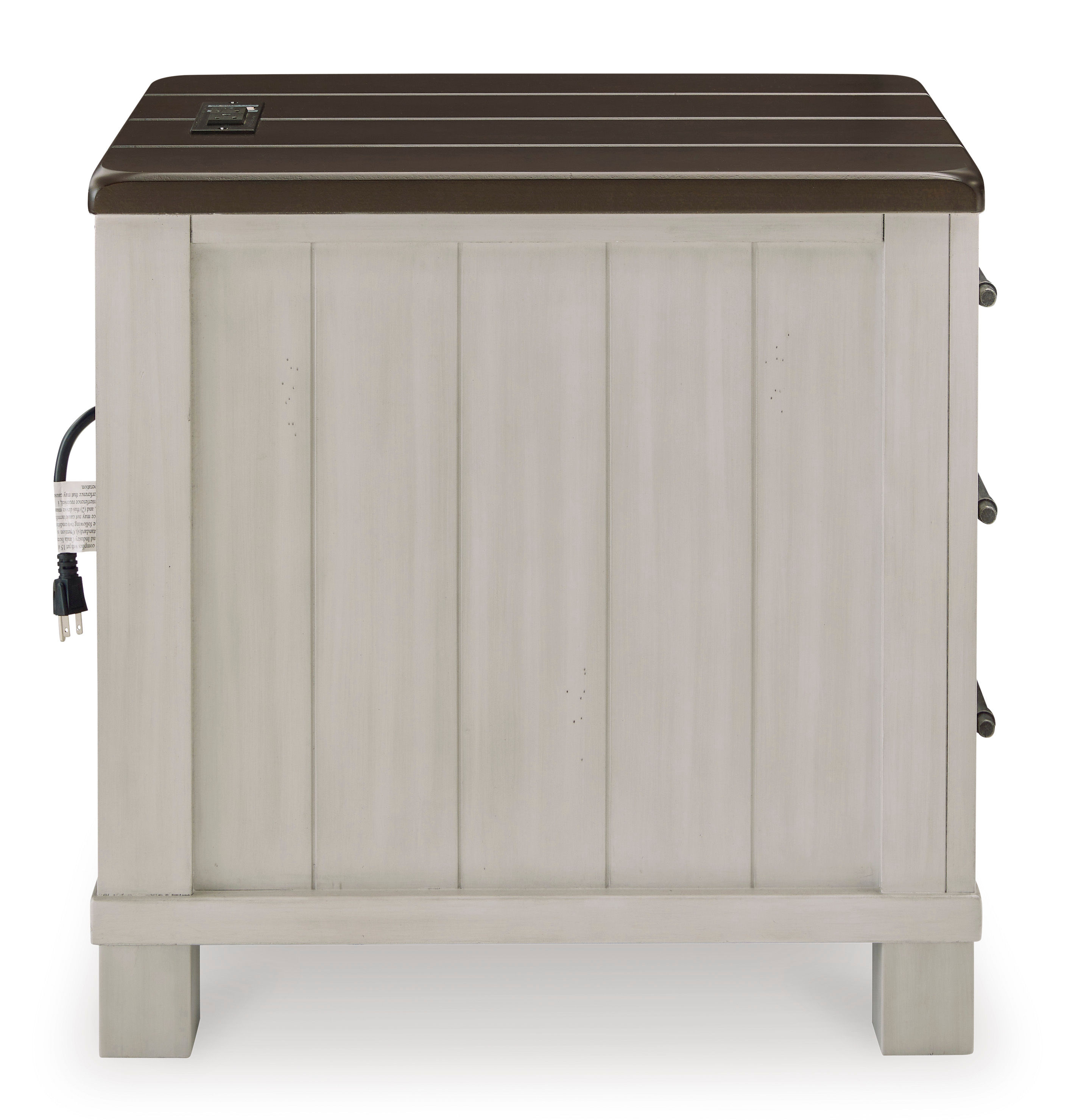 Make a farmhouse-inspired statement with our Darborn end table. Beautifully crafted to stand the test of time, the planked effect and clean two-tone finish lend a relaxing vintage feel. Spacious storage drawers with metal pulls double up on form and function. Plus, this end table's dual USB charging ports keep up with your high-tech lifestyle.