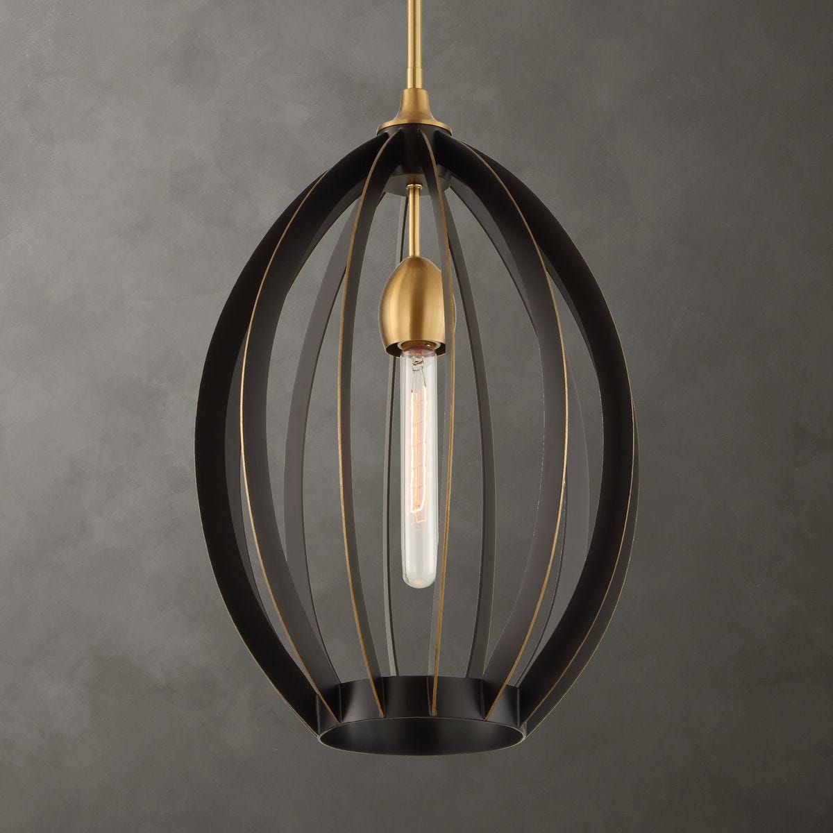 An architectural oval drop 1 Lt pendant of linear bands in dark bronze finish with warm brass accents. 1-60 watt max Edison socket our designer suggests a T type bulb. Bulbs not included. Supplied with 15' wire, 3-12" stems and 1-6" stem for adjustable installation.