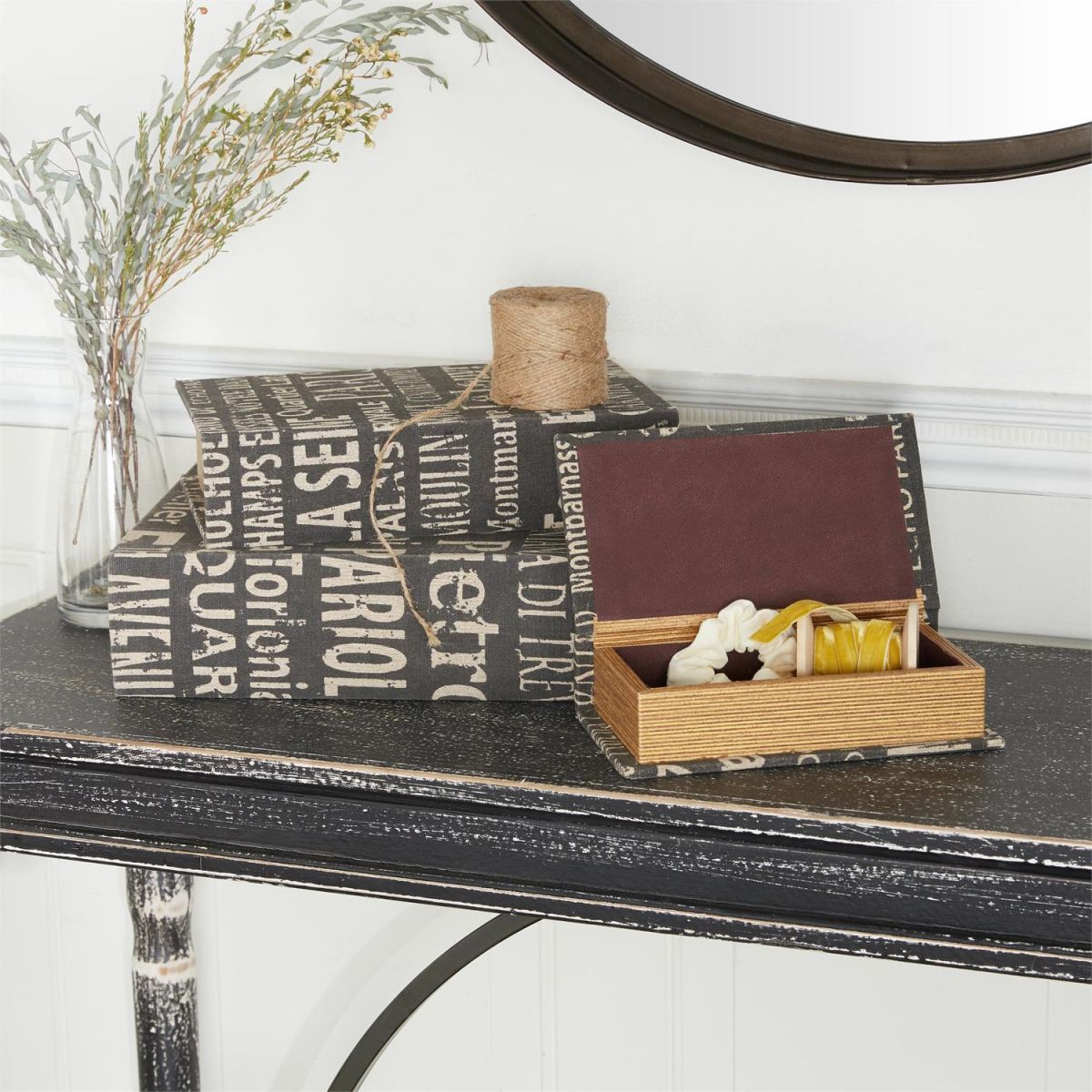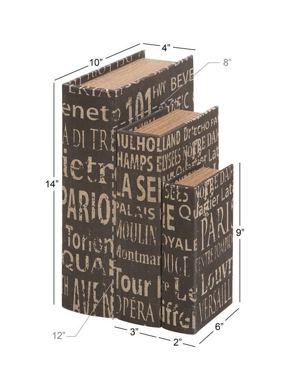 Designed with timeless sophistication, rich old-world textures and warm hues come together for a refined classic taste of luxury. Crafted from MDF and burlap, this black decorative box set is both durable and stylish. Rectangle gift boxes set boasts a traditional style, adorned in a rich textured black finish with brown text that exudes elegance and sophistication. The wood set of 3 boxes features exquisite book cover typography, infusing any space with vintage vibes.