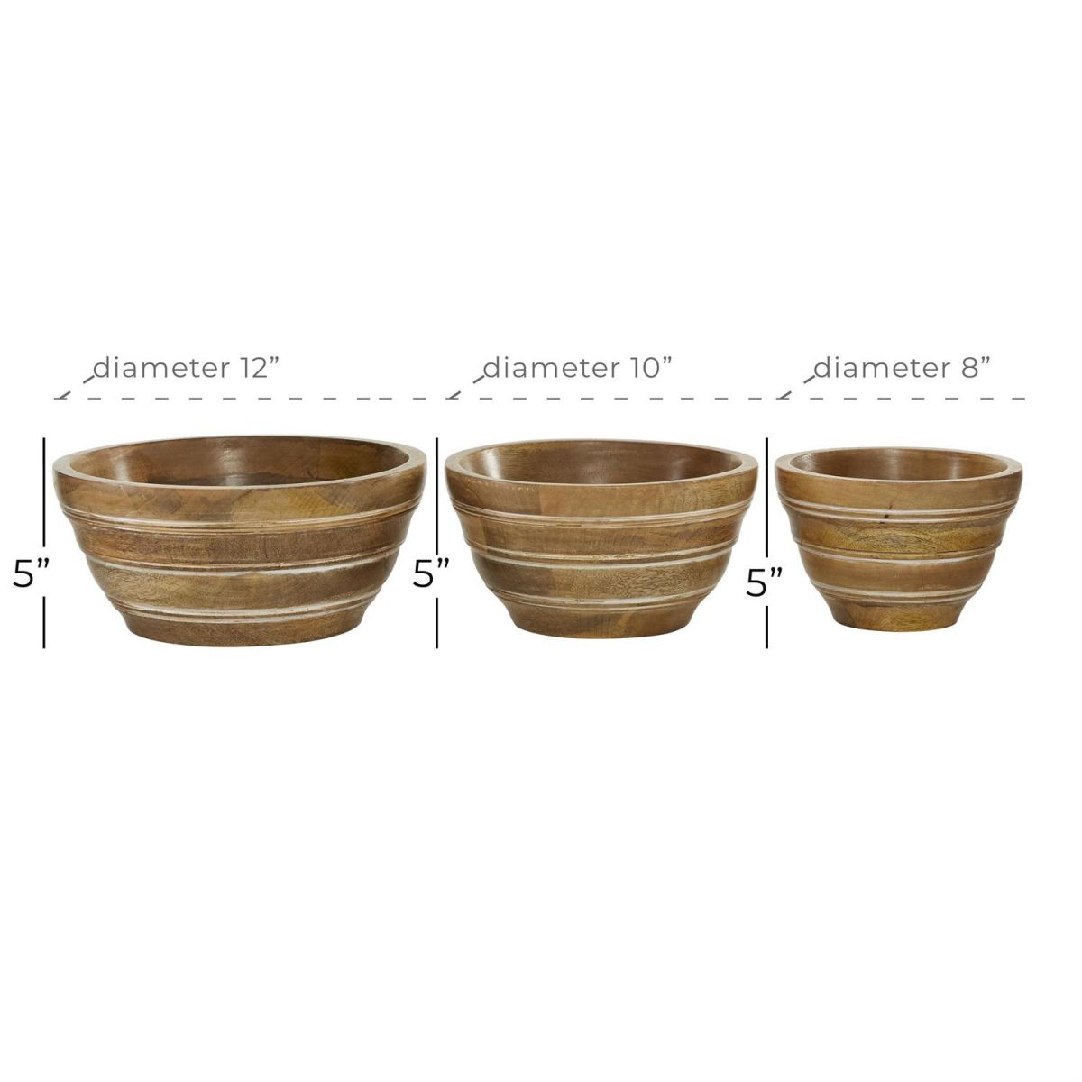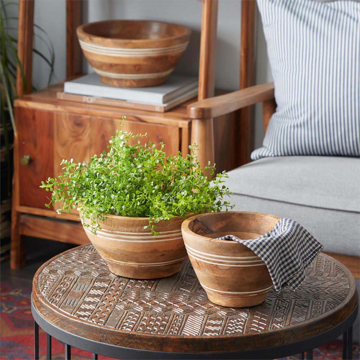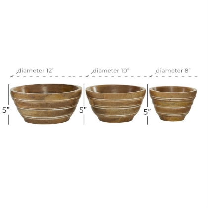 Immerse yourself in the tranquil harmony and romantic beauty of pieces that unite old-world textures with ornate details, and warm vibrant hues that create an endless summer aesthetic. These brown wood bowls are made of solid wood for a durable and sturdy construction. These decorative serving bowls showcases brown wood bowl with white horizontal accent. A set of three wood bowls with wide and deep setting with smooth interior and accent white lines on exterior.