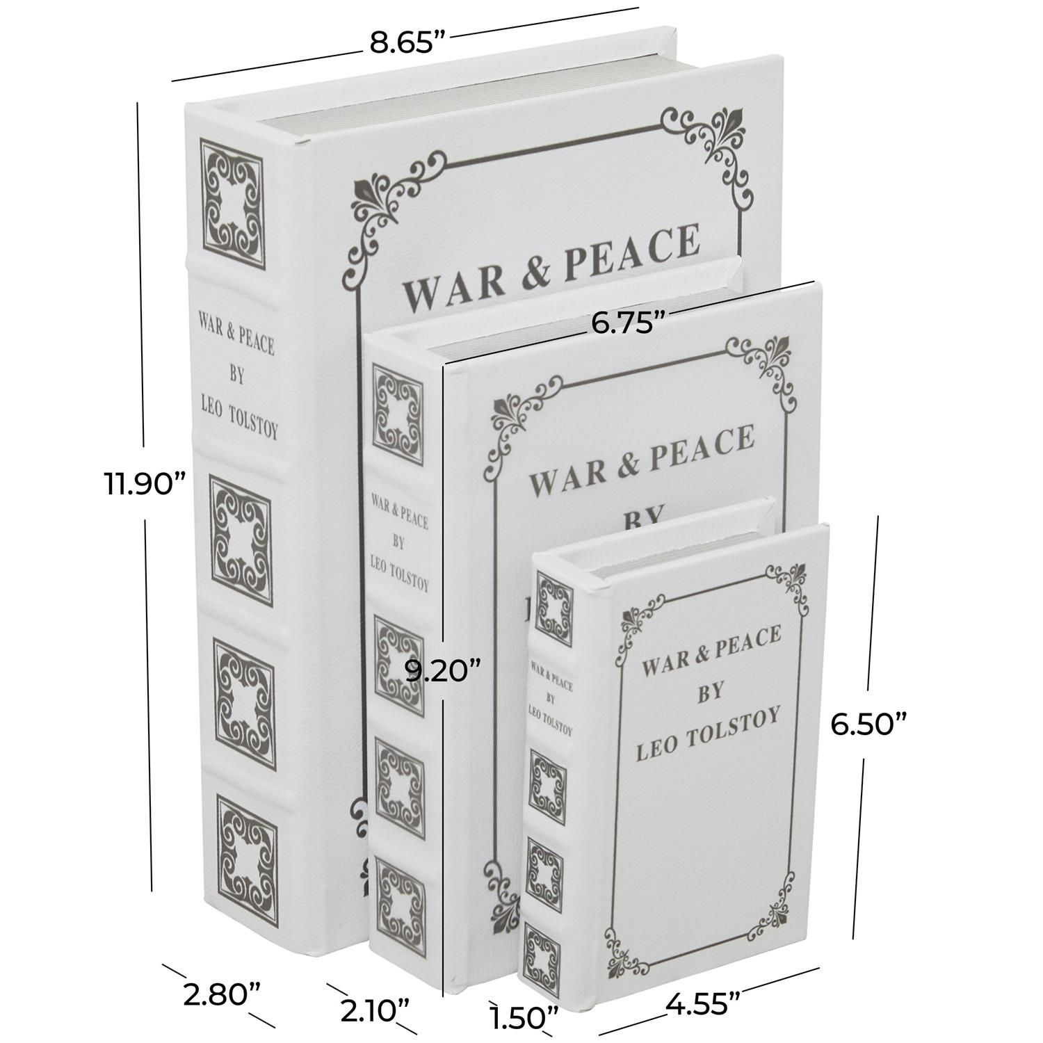Designed with timeless sophistication, rich old-world textures and warm hues come together for a refined classic taste of luxury. Crafted from MDF and faux leather, this light gray decorative box set offers durability and longevity. Rectangle gift boxes set showcases a sophisticated matte light gray finish, complemented by delicate black lettering and scroll details. This faux leather set of 3 boxes comes with hidden storage compartments in various sizes, making them perfect for organization or as fillers on bookcases and shelves.