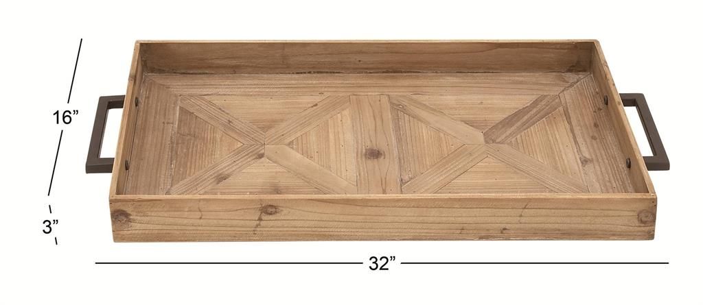 Embrace artistic expression with a style that highlights bold designs with sleek lines, neutral elements, and a minimalist aesthetic. Brown living room decor tray is made of quality fir wood and iron, ensuring durability and style. Rectangle decorative tray highlights a washed brown finish with matte black handles, exuding rustic charm. Featuring a rectangular body with two x-shaped accent patterns on its inner base and outer grip metal handles, this fir tray is both stylish and highly functional.