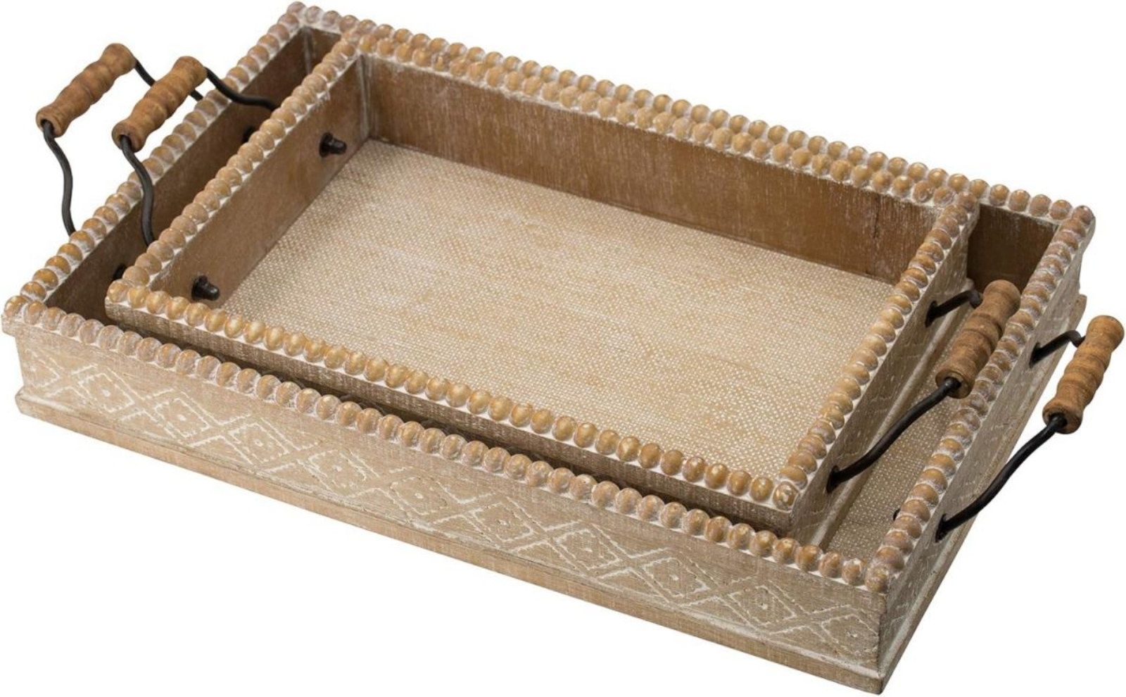 This decorative centerpiece tray set of 2 features stylish metal and fir wood construction with two handles for a unique transitional look. Crafted from high quality materials with a bold edging accent, it’s a wonderful way to give a new feel to tables in living rooms, dining rooms, and much more. Add this large tray set to anywhere that needs a little extra style.