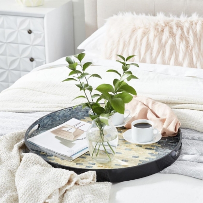 Inspired by blissful serenity and the allure of the sea, where soothing hues and natural textures bring effortless charm to the home. Blue living room decor tray set is crafted with MDF and Capiz shell for an exquisite touch. Round decorative tray set showcases a polished smokey blue finish inlay with beautifully contrasted with beige hues, and sleek black frame. Boasting a bricked Capiz pattern on the inner tray and a matte black wooden base with handles, this mother of pearl set of 3 trays offers a unique coastal vibe.