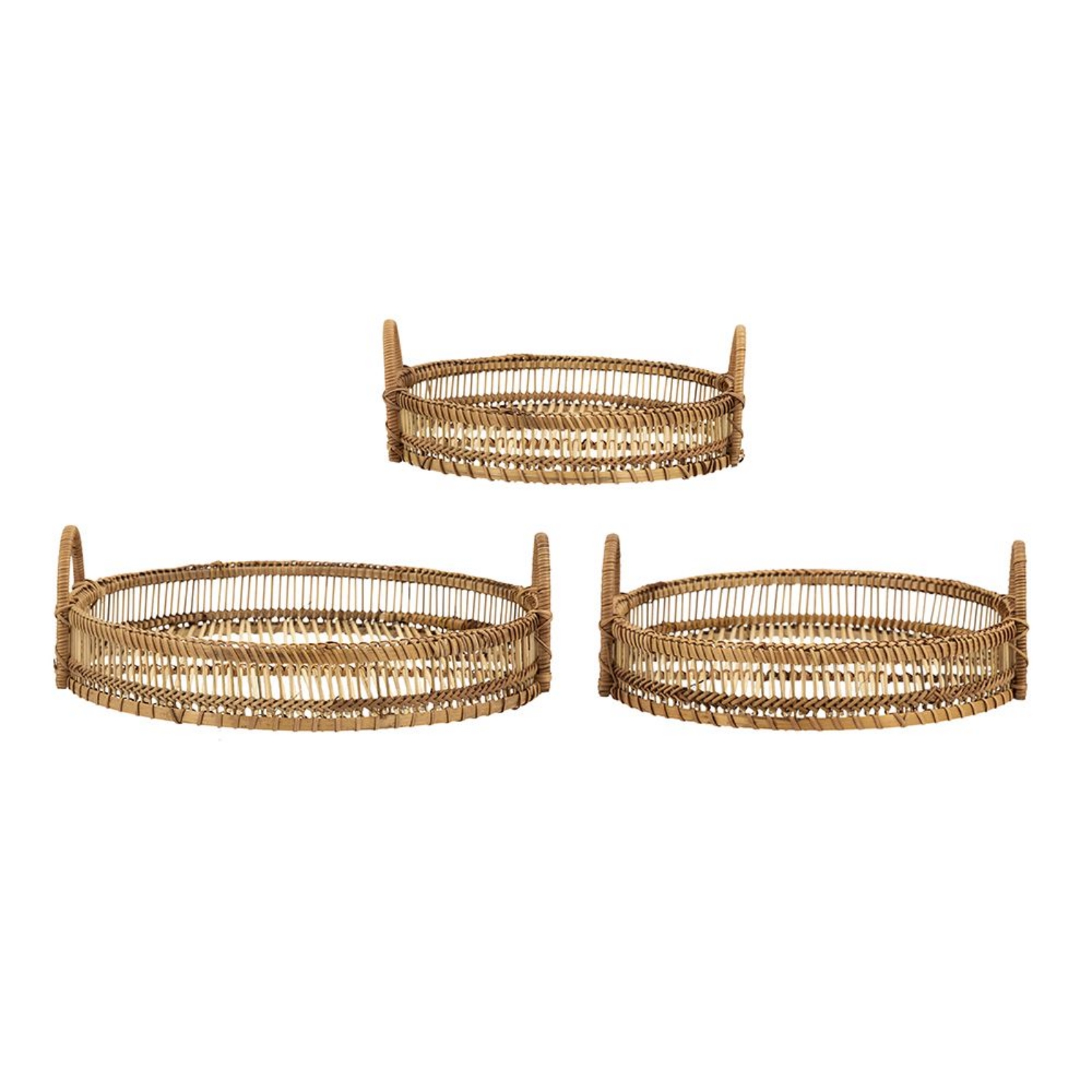 Envision the calming waters of the coastal lifestyle and bamboo trees lining the water. Bring that theme into your designs with the Set of 3 Sienna Bamboo Woven Trays. The woven bamboo displays a stunning organic brown coloring that compliments the natural color scheme of any bohemian-inspired design. Displayed as a table accent this set of 3 trays, creates the casual lifestyle in any room. An ideal match for coastal, bohemian, tropical, rustic, farmhouse, and even Scandinavian themes, this set can be easily integrated into your existing decor.