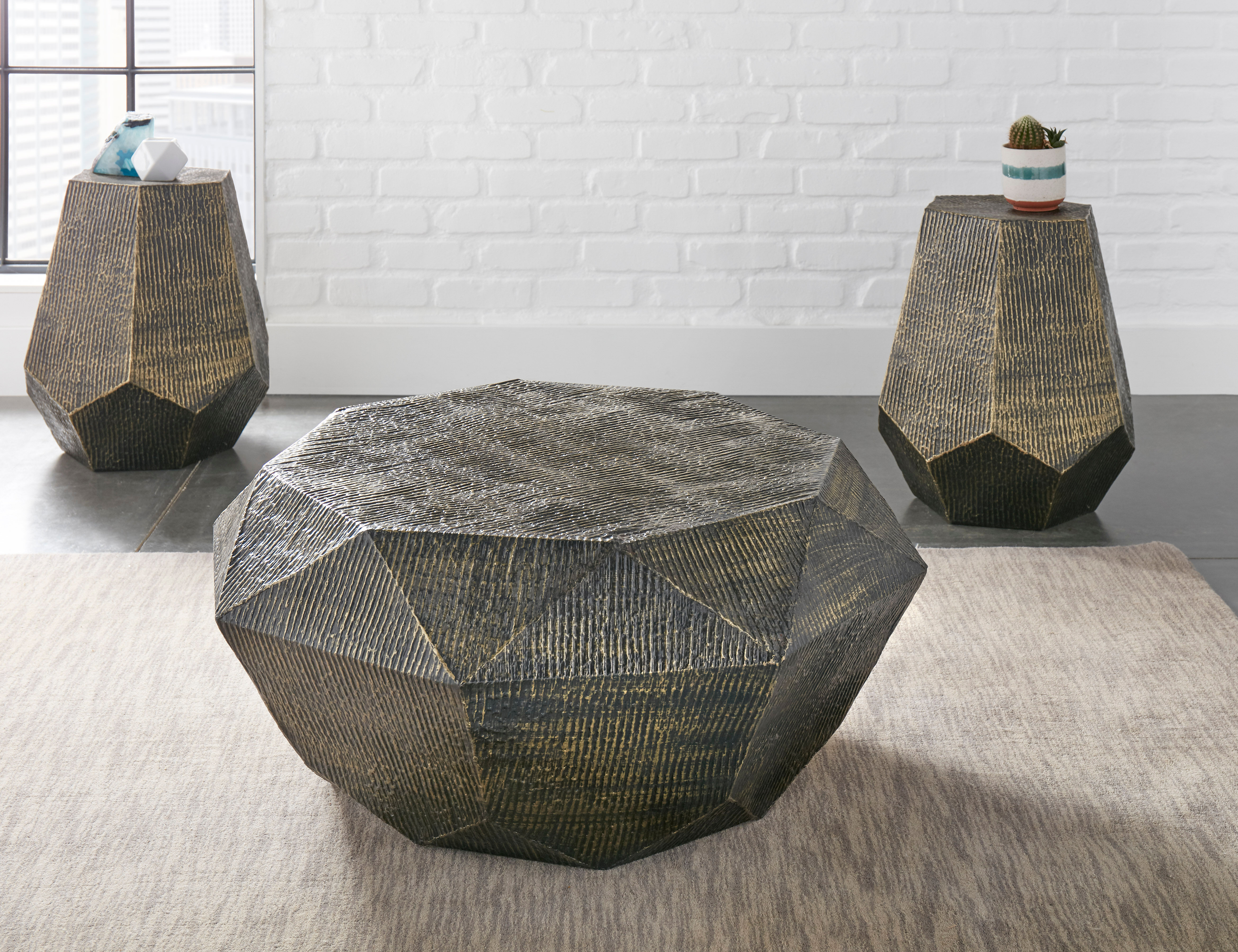 A hexagonal End Table with the appearance it was plucked from nature, the Donato End Table features a shimmering oil-rubbed brass finish over hand-stamped iron that creates a contemporary table built for modern style. Pair with the Donato Cocktail Table for a complete Living Room package.