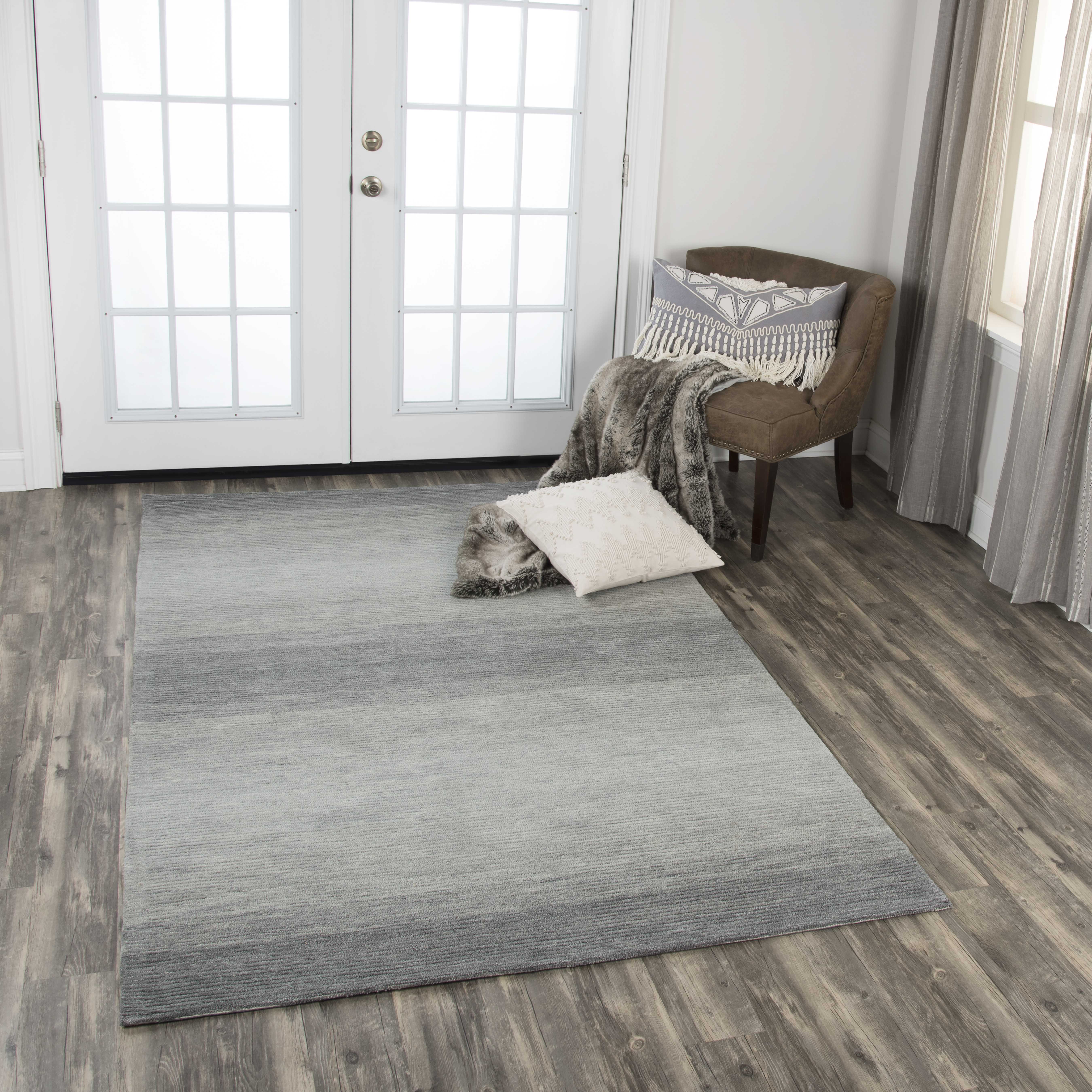 Graduating shades of color create a soothing Ombre effect on this stunning area rugs. Soft shades fade ffortlessly from Charcoal to Gray and Silver then back again. 100% premium wool is blended and dyed to create subtle color variation thought out. Constructed with alternating rows of Loop, then Cut pile, adds texture and depth to create a look that is sophisticated and easy to add to most any decor.