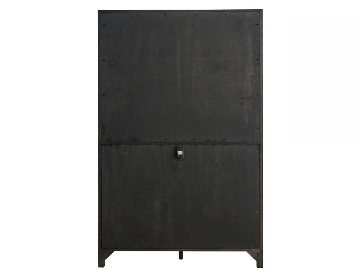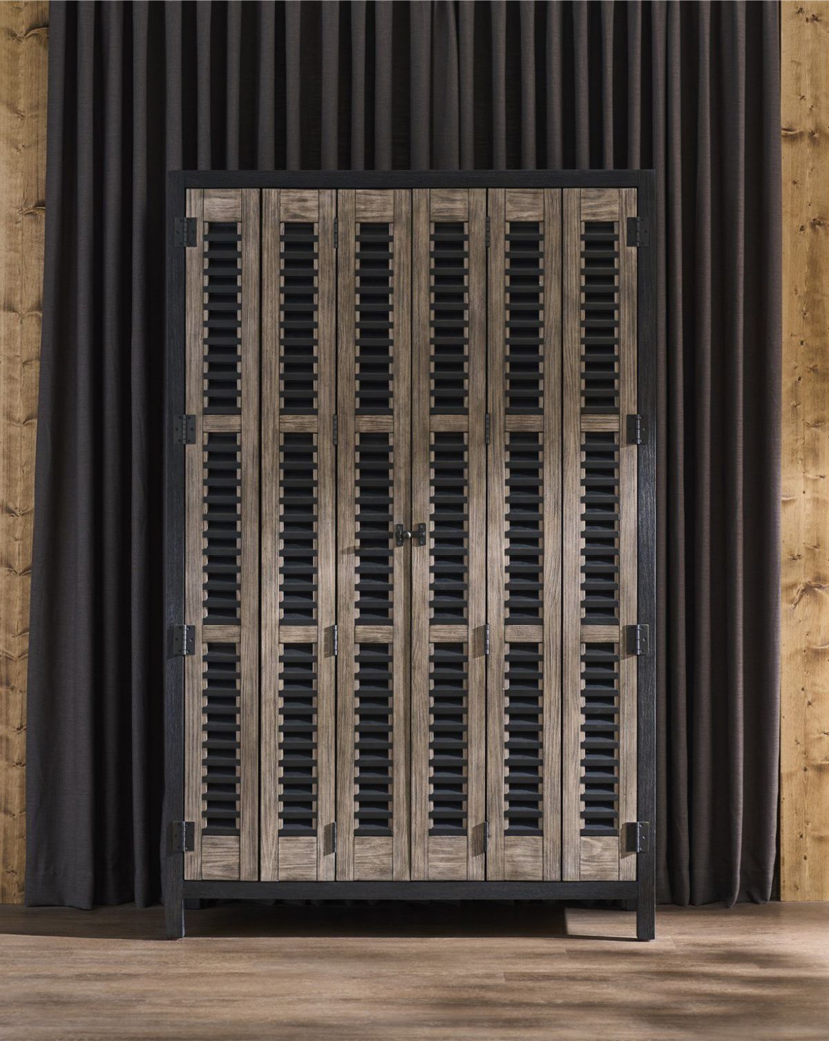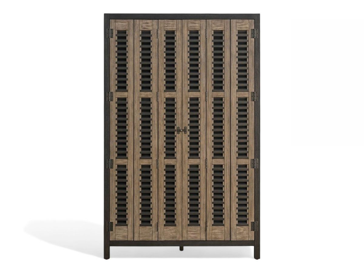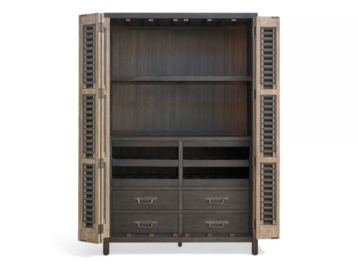 The Dwell Bar Cabinet makes a striking statement with its shutter-style doors and mixed-material design. The contrasting dark wood frame and warm wood and metal panels create a sophisticated, industrial-inspired look. This cabinet offers ample storage for your bar essentials, making it a stylish and functional centerpiece for any entertaining space.