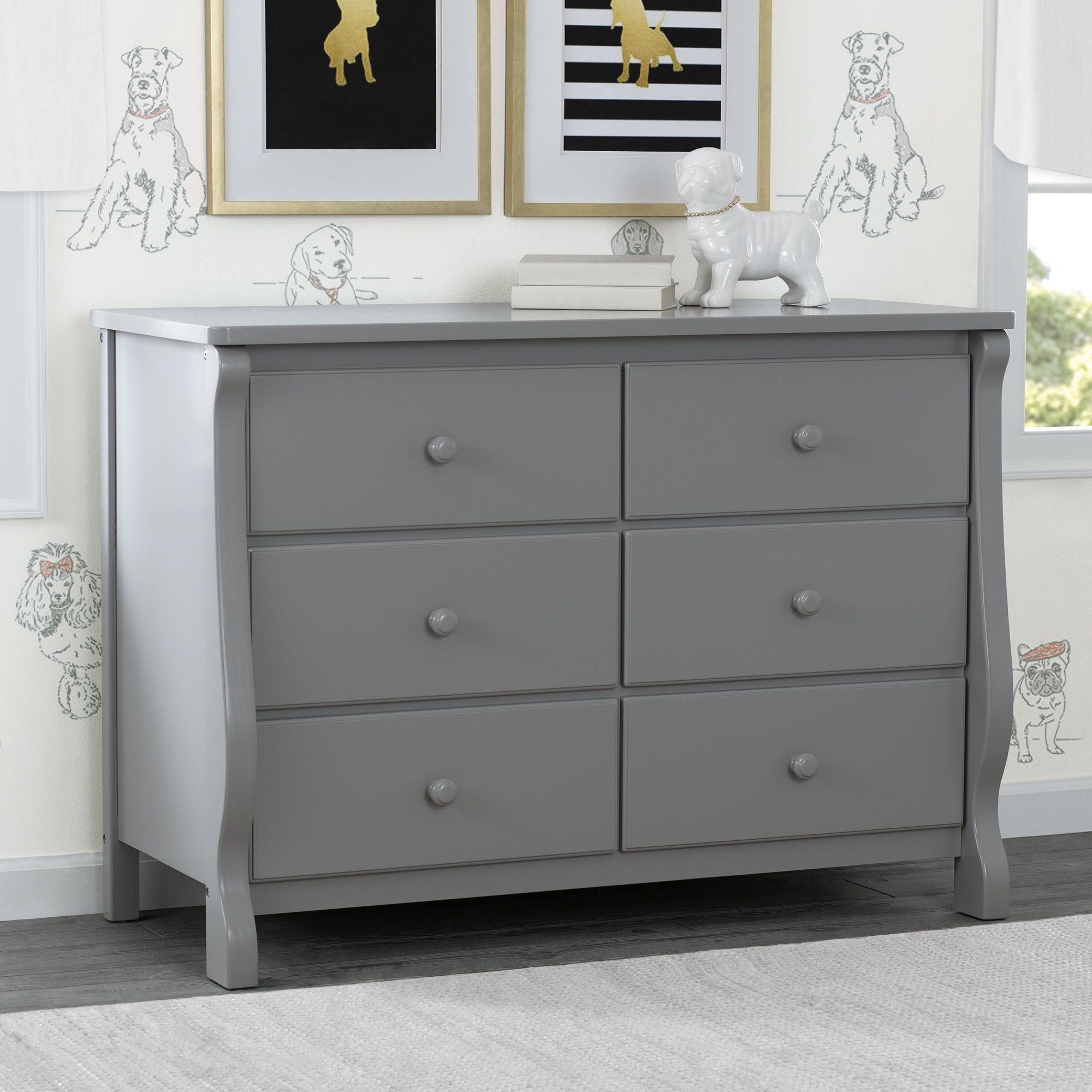 A nursery must-have, the simply styled 6 Drawer Dresser from Delta Children is crafted to coordinate with all of the brand's cribs. Featuring slightly curved legs and easy-to-grasp knobs, its durable metal glide system with safety stops prevents drawers from falling out. All Delta Children dressers meet the requirements of ASTM F2057, the voluntary industry tip over standard for dressers. For your children's safety, only purchase dressers that comply with this standard. For additional security, Delta strongly recommends that all dressers in your home be anchored; all Delta dressers include a wall anchor.