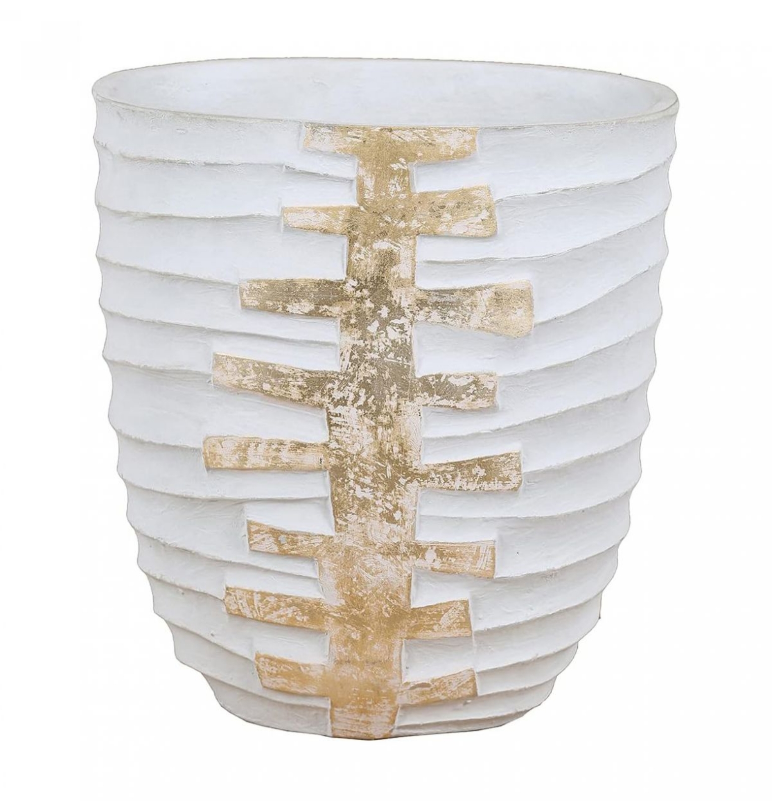 Create a lovely accent on an end table or mantel with this Eco mix vase. The white and gold finish gives this vase a subtle color that can fit with a variety of decor schemes. The vase has a wide opening with a horizontal rippled effect for a distinct look.