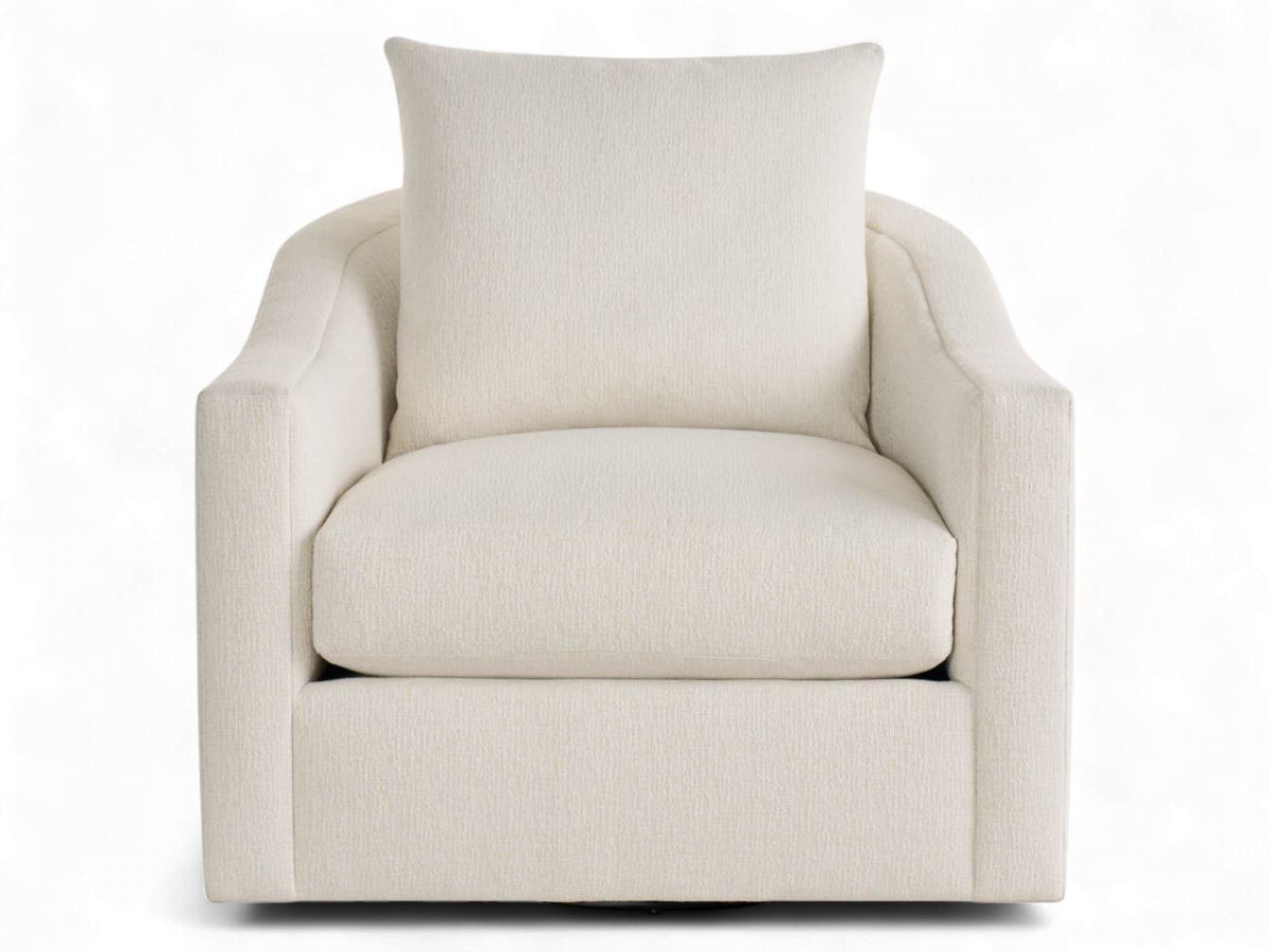 The Eli swivel chair features a clean, contemporary design with gently sloped arms and a soft ivory fabric. Its box seat cushion and plush back pillow provide both comfort and structure, while the hidden swivel base allows for smooth 360-degree rotation. Stylish and versatile, it’s a perfect addition to living rooms, bedrooms, or reading nooks.
