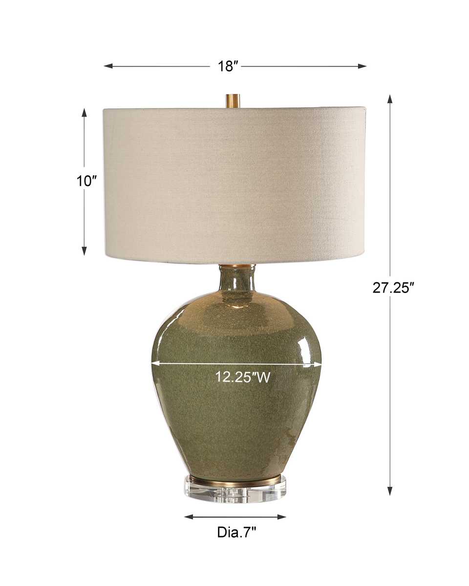 This ceramic base is finished in a distressed emerald green glaze, accented with antique brass plated details and a crystal foot. The round hardback drum shade is a light beige linen fabric with natural slubbing. Due to the nature of fired glazes on ceramic lamps, finishes will vary slightly.